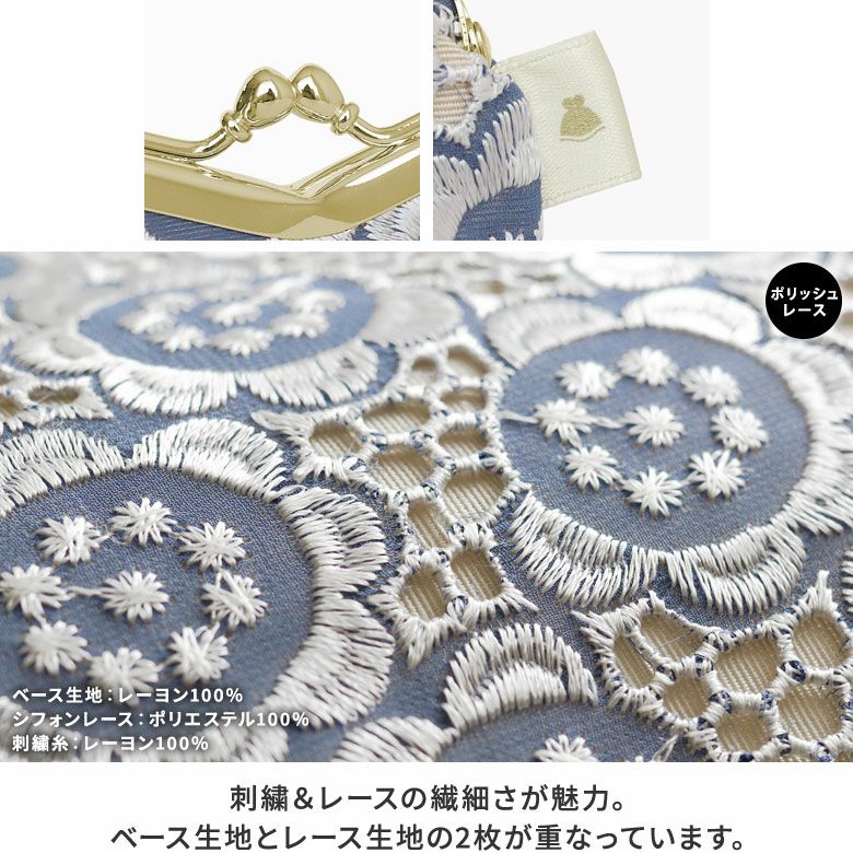 ポリッシュレース:刺繍&レースの繊細さが魅力。ベース生地とレース生地の2枚が重なっています。 繊細なレース使いが上品で可憐なイメージのポリッシュレースシリーズ。おめかしスタイルやパーティーシーンに合わせてもgood。お友達やお母さんへのプレゼントにもピッタリです。