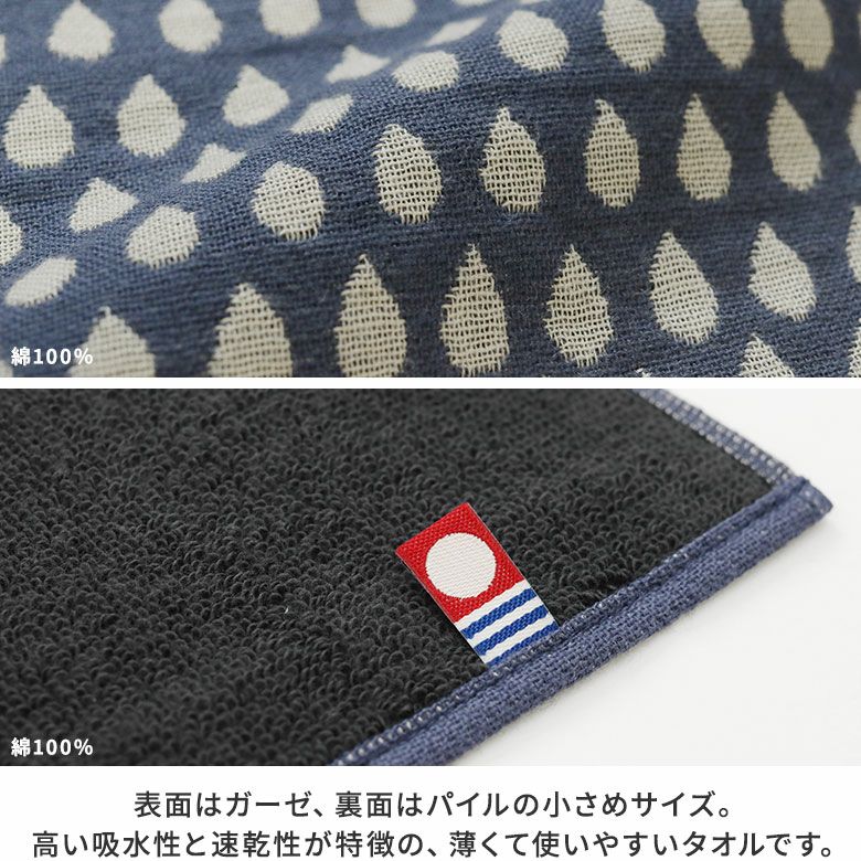 表面はガーゼ、裏面はパイルの小さめサイズ。高い吸水性と速乾性が特徴での薄くて使いやすいタオルです。