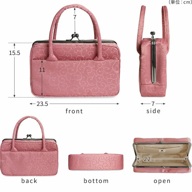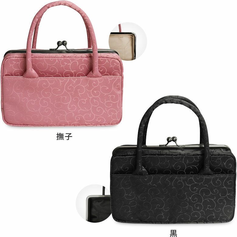 フォーマルシーンにもおすすめ。上品な唐草模様の利休バッグ。 結婚式やお茶席で活躍する、コンパクトなハンドバッグです。 >納期についてのご案内 備考 ※生地の裁断により柄の出方は一点一点異なります。柄の指定は受け付けておりません。 ※がま口はその特性上、荷物の大きさや重さで強い力が加わると口金が開きやすくなります。 ※内寸、外寸ともに実寸で表記しています。※置いた状態で測っているので多少の誤差が生じる場合があります。※手づくりのため、細かな個体差があります。※生地の厚みや素材によって表記のサイズと多少の誤差が生じる場合があります。 あらかじめご了承ください。 販売期間 「在庫限り・再入荷の予定なし」数量限定生産品のため売り切れ次第販売終了となります。また各種オーダーの対象外です。 サイズ詳細 <本体> 外寸:高さ18cm、幅23.5cm、マチ7cm 内寸:高さ15.5cm、幅22cm 内ポケット:高さ9cm、幅16cm 外ポケット:高さ11cm、幅23.5cm <持ち手> 幅1.5cm、高さ7cm <重さ> 260g(持ち手含む) ※商品サイズの表記はおおよその値となります。 ※外寸は口金を含みます。 ※内寸は口金を含みません。 素材 <袋> 表地:ポリエステル100% 裏地:レーヨン100% <口金> 鉄(ブラック) 製造 日本製(京都秀和がま口製作所) お支払方法 クレジットカード/コンビニ後払い/Amazon Pay/楽天ペイ/PayPayクレジットカード決済、Amazon Pay、PayPay、楽天ペイをご選択の場合、システムの都合上、商品発送前にご請求させて頂く場合がございます。何卒ご了承下さいますようお願い申し上げます。規約に基づき返品、キャンセルもお受付できます。 発送方法 ゆうパック:全国一律770円 日時指定可能 ※10,000円以上ご購入頂いた場合は送料無料になります。 商品説明 フォーマルシーンにもおすすめ。上品な唐草模様の利休バッグ。 結婚式やお茶席で活躍する、コンパクトなハンドバッグです。 メイン収納にはスマホやハンカチ、長財布などを入れられます。背面側には整理しやすい内ポケット付き。本体の両サイドにはオープンポケットがあります。 MATERIAL 唐草模様をきめ細やかに表現した、上品な光沢のあるポリエステル素材を使用。角度によって変わる陰影が美しい繊細な生地です。 COLOR ・撫子 ・黒