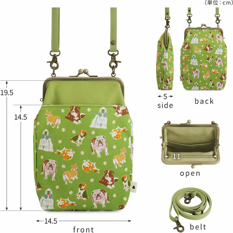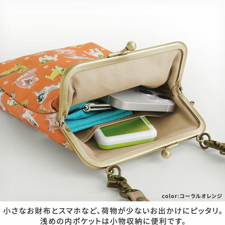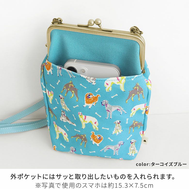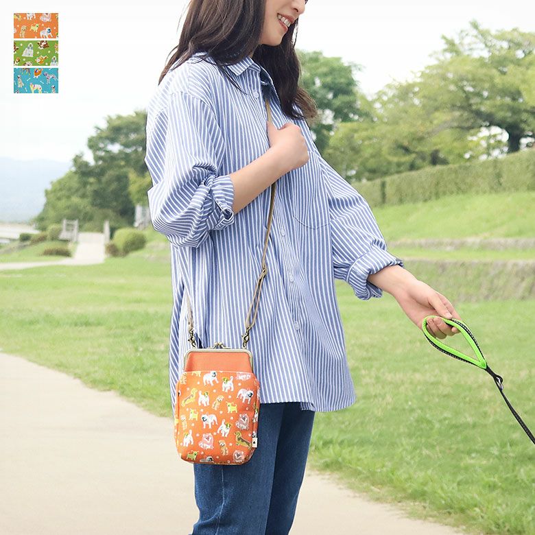 愛犬とのお散歩にぴったりな小さめポシェット。 スマホショルダーとしても使えるお散歩ポシェットです。 >納期についてのご案内 備考 ※生地の裁断により柄の出方は一点一点異なります。柄の指定は受け付けておりません。※商品の仕様や価格は予告なく変更する場合があります。※がま口はその特性上、荷物の大きさや重さで強い力が加わると口金が開きやすくなります。※内寸外寸ともに実寸で表記しています。※生地の種類によって表記のサイズと誤差が生じる場合があります。※置いた状態で測っているので多少の誤差があります。※手づくりのため個体差があります。 あらかじめご了承ください。 販売期間 「在庫限り・再入荷の予定なし」数量限定生産品のため売り切れ次第販売終了となります。また各種オーダーの対象外です。 サイズ詳細 <本体> 外寸:高さ21.5cm、幅14.5cm、マチ5cm 内寸:高さ19.5cm、幅11cm 外ポケット:高さ14.5cm、幅13cm 内ポケット:高さ10cm、幅11cm <ショルダーベルト> 幅1cm、長さ74.5cm~137cm(パーツ含む) <重さ> 145g(ベルト含む) ※外寸は口金を含みます。※内寸は口金を含みません。 使用可能なアイテム ・ポシェット用 120cmショルダーチェーン - NK/GL/AG・ポシェット用 1cm幅合皮ベルト(豆レバー)- NK/AG ※調整不可・ポシェット用 1cm幅1本線送り合皮ベルト(豆レバー)NK/AG 素材 <袋> メイン生地:綿100%(8号帆布)、サブ生地:綿100% 裏地:綿100% <口金> 鉄(アンティークゴールド) <ショルダーベルト>合皮 <ショルダーベルトパーツ> 亜鉛合金、鉄(アンティークゴールド) 製造 日本製(京都秀和がま口製作所) お支払方法 クレジットカード/コンビニ後払い/Amazon Pay/楽天ペイ/PayPayクレジットカード決済、Amazon Pay、PayPay、楽天ペイをご選択の場合、システムの都合上、商品発送前にご請求させて頂く場合がございます。何卒ご了承下さいますようお願い申し上げます。規約に基づき返品、キャンセルもお受付できます。 発送方法 ゆうパケット:全国一律330円 1個までなら発送可能 ゆうパック:全国一律770円 日時指定可能 ※10,000円以上ご購入頂いた場合は送料無料になります。 商品説明 愛犬とのお散歩にぴったりな小さめポシェット。 スマホショルダーとしても使えるお散歩ポシェットです。 小さなお財布や折りたたみのエコバッグとスマホなど、荷物が少ないお出かけに大活躍。旅先でのサブバッグ、リュックと同時持ちができるミニショルダーバッグとして、マルチな使い方で活躍してくれる優秀なポシェットです。シンプルな構造で持ちやすいのでプレゼントにもおすすめ。 内ポケットは浅めの作りになっているので、小物が出し入れしやすくなっています。外側には出し入れしやすいオープンポケット付き。サッと取り出したいものを入れられます。※写真で使用のスマホは約15.3×7.5cm SERIES カラフルでにぎやかな愛らしい犬たちが大集合!チワワからゴールデンレトリーバーまで、様々な犬種を手描きタッチのイラストで表現したColorful Dog(カラフルドッグ)シリーズ。普段使いにはもちろん、犬好きさんへのプレゼントにもおすすめです。 MATERIAL & COLOR ナチュラルで優しい雰囲気の8号帆布に愛らしい犬たちのイラストをプリント。肉球×小型犬が元気な印象のコーラルオレンジ、ボール×中型犬が楽し気なアップルグリーン、ホネ×大型犬がご機嫌なターコイズブルーの3色展開です。