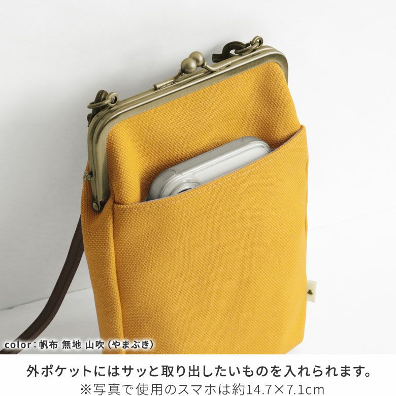 ぶらっとお散歩にぴったりな小さめポシェット。 小さなお財布や折りたたみのエコバッグとスマホなど、荷物が少ないお出かけにピッタリの、がま口お散歩ポシェットです。 >納期についてのご案内 備考 ※生地の裁断により柄の出方は一点一点異なります。柄の指定は受け付けておりません。※HAKUにゃんこには箔プリント加工を施しております。箔転写部分は非常にデリケートです。箔が剥がれるおそれがありますので、アイロンがけはできません。汚れが気になる箇所は、水を少量含ませたコットンや柔らかい布でやさしく拭き、自然乾燥させてください。固いものや、ザラついたものとの摩擦にご注意ください。箔転写部分が商品角にある場合、生地の特性として、一部はがれなどがある場合があります。※デニムに用いられている染料は、特に濃い色の場合は汗や水濡れ、摩擦などにより色移りが生じますので、白や淡色の物との併用の際は充分ご注意ください。時間の経過や使用ごとに色目が変化するデニムの特徴をお楽しみください。※商品の仕様や価格は予告なく変更する場合があります。※がま口はその特性上、荷物の大きさや重さで強い力が加わると口金が開きやすくなります。※内寸外寸ともに実寸で表記しています。※生地の種類によって表記のサイズと誤差が生じる場合があります。※置いた状態で測っているので多少の誤差があります。※手づくりのため個体差があります。 あらかじめご了承ください。 サイズ詳細 <本体>外寸:高さ21cm、幅14.5cm、マチ4.5cm 内寸:高さ19.5cm、幅11cm 外ポケット:高さ14.5cm、幅11cm 内ポケット:高さ9.5cm、幅11cm <ショルダーベルト> 幅1cm、長さ120cm(金具含む) <重さ>135g(ベルト含む) 使用可能なアイテム ・ポシェット用 120cmショルダーチェーン - NK/GL/AG・ポシェット用 1cm幅合皮ベルト(豆レバー)- NK/AG ※調整不可・ポシェット用 1cm幅1本線送り合皮ベルト(豆レバー)NK/AG 素材 【本体】<8号帆布・綿布> 表地:綿100%、裏地:綿100% <HAKUにゃんこ> 表地:綿100%、裏地:綿100%(※裏地の色は共通) <デニム> 表地:綿100%、裏地:綿70%、ポリエステル30% 【ショルダーベルト】合皮(ダークブラウン)【ショルダーベルトパーツ】亜鉛合金・鉄(アンティークゴールド)【口金】鉄(アンティークゴールド) 製造 日本製(京都秀和がま口製作所) お支払方法 クレジットカード/コンビニ後払い/Amazon Pay/楽天ペイ/PayPayクレジットカード決済、Amazon Pay、PayPay、楽天ペイをご選択の場合、システムの都合上、商品発送前にご請求させて頂く場合がございます。何卒ご了承下さいますようお願い申し上げます。規約に基づき返品、キャンセルもお受付できます。 発送方法 ゆうパケット:全国一律330円 2個までなら発送可能 ゆうパック:全国一律770円 日時指定可能 ※10,000円以上ご購入頂いた場合は送料無料になります。 商品説明 ぶらっとお散歩にぴったりな小さめポシェット。 小さなお財布や折りたたみのエコバッグとスマホなど、荷物が少ないお出かけにピッタリの、がま口お散歩ポシェットです。 少し大きめのスマホショルダー使いや旅先でのサブバッグ、リュックと同時持ちができるミニショルダーバッグとして、マルチな使い方で活躍してくれる優秀なポシェットです。シンプルな構造で持ちやすいので、プレゼントにもおすすめです。 内ポケットは浅めの作りになっているので、小物が出し入れしやすくなっています。 外側には出し入れしやすいオープンポケット付き。サッと取り出したいものを入れられます。※写真で使用のスマホは約14.5×7cm SERIES 8号帆布:AYANOKOJIでは定番の8号帆布を使用しています。帆布は耐久性に優れ、通気性が良く、摩擦にも強い素材です。使い始めは硬く感じますが、使えば使うほど柔らかくなり、程よく手に馴染んできます。 HAKUにゃんこ:8号帆布にキラキラ輝く猫柄の箔プリント。猫の顔の形のドット柄を箔押しプリントした、猫好きさんにはたまらないシリーズ。キラッと光るにゃんこが個性を演出してくれます。 綿布 ヒッコリー:8号帆布よりもクタッと柔らかい印象の綿布を使用しています。流行りに左右されないシンプルなストライプ柄。男性女性問わず使いやすいベーシックな柄でオールシーズン使えます。 デニム インディゴ:岡山県の老舗織屋で30年以上作り続けているロングセラーのデニム生地を使用。糸の太さが均一でなくムラがある事で独特の風合いがあります。ごわつきがなく滑らかで柔らかい肌触りが特徴的。ネームタグはベージュのスエード調生地にレーザーで刻印が施されており、ワンポイントになっています。