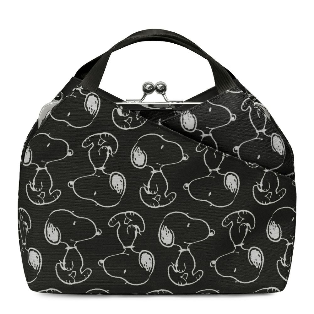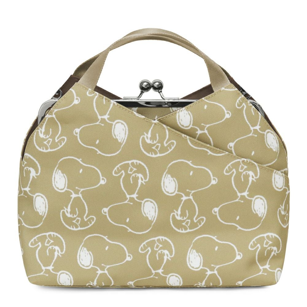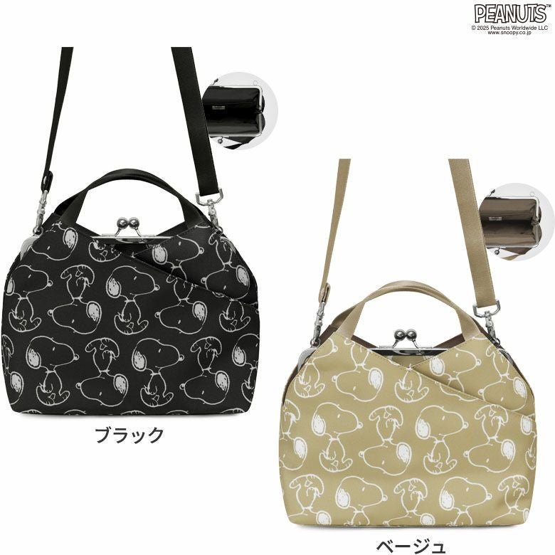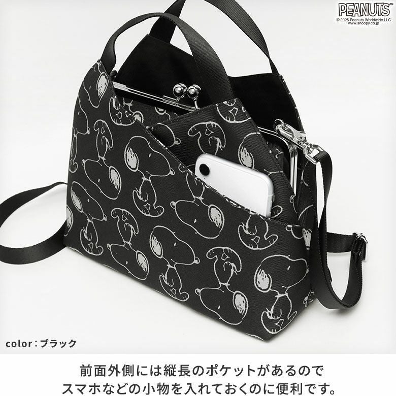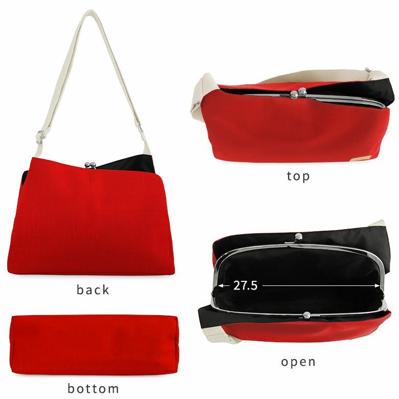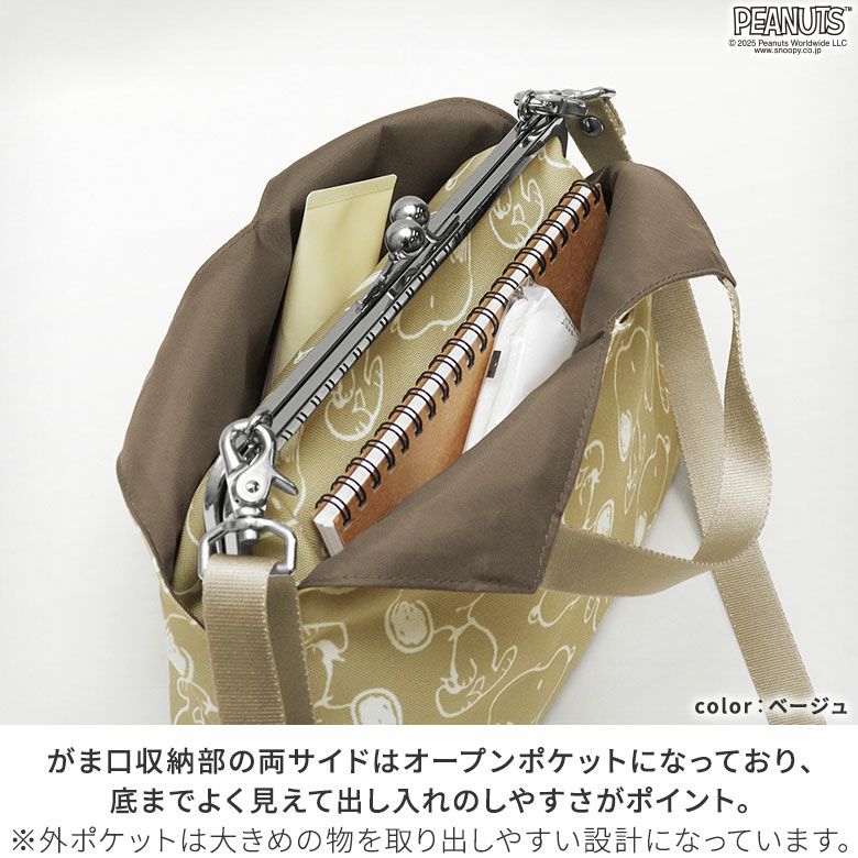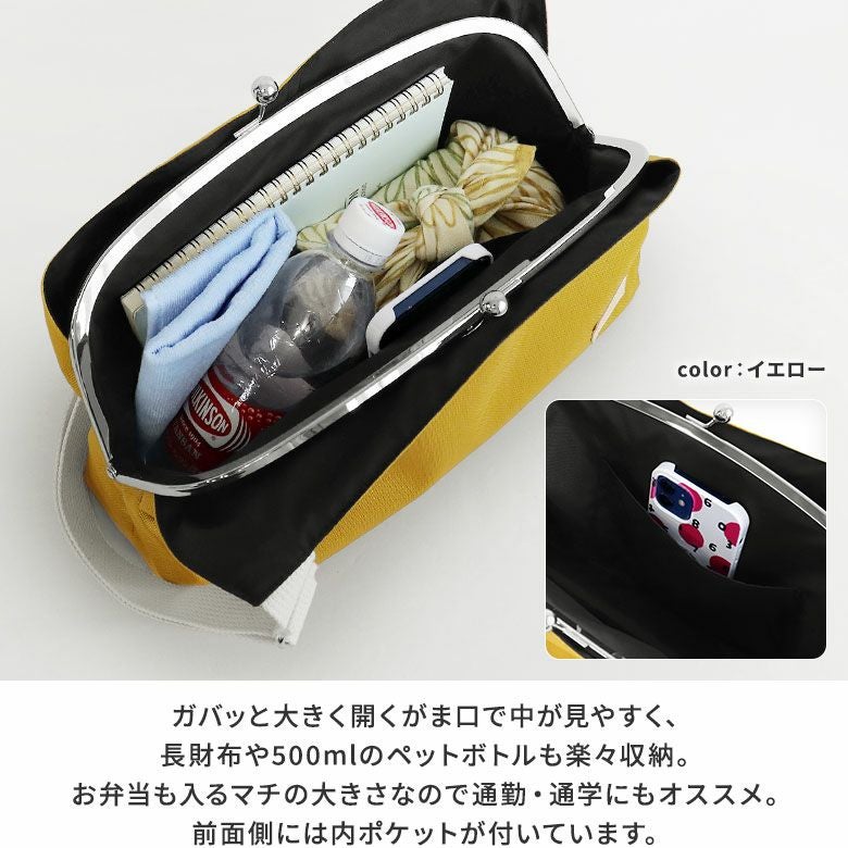 大きく開くがま口で中身を探しやすく、長財布や500mlのペットボトルも楽々収納。外ポケットにはA4サイズも入ります。