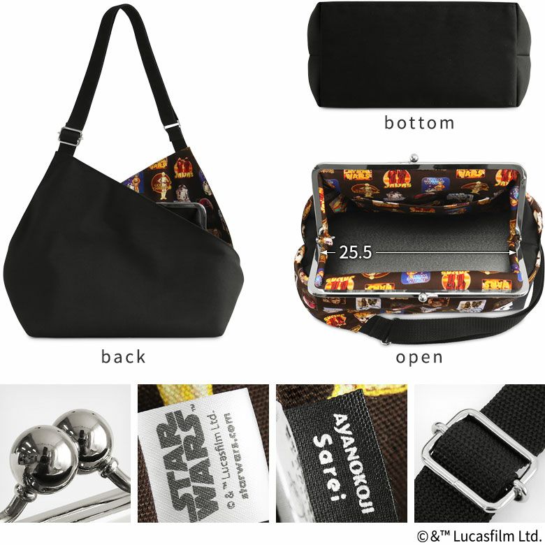 「スター・ウォーズ」のスペシャルアイテム登場! 「STAR WARS G.W. COLLECTION -PARCO 55th CAMPAIGN-」のスペシャルアイテムが数量限定で登場。 見た目以上の収納量が自慢、シンプルなワンショルダーバッグ。 カシュクールからインスパイアされたユニークかつ、エレガントなフォルムが特徴的。大きく開くがま口で中が見やすく、容量もたっぷり入ります。両面の大きな外ポケットや、長さ調節ができるベルトなど、機能性も兼ね備えたイチオシのショルダーバッグです。 ガバッと大きく開くがま口で中が見やすく、長財布や500mlのペットボトルも楽々収納。お弁当も入るマチの大きさなので通勤・通学にもおすすめ。 内ポケットも付いて、スマホなどの小物収納に便利です。 本体の両面にある大きな外ポケットにもノートなどが収納可能。※A4サイズも入りますが角が少しはみ出ます。※外ポケットは大きな物を取り出しやすい設計になっています。スマホなどの小さい物はがま口内に収納することをおすすめします。 >納期についてのご案内 備考 ※生地の裁断により柄の出方は一点一点異なります。柄の指定は受け付けておりません。 ※がま口はその特性上、荷物の大きさや重さで強い力が加わると口金が開きやすくなります。※内寸、外寸ともに実寸で表記しています。※置いた状態で測っているので多少の誤差が生じる場合があります。※手づくりのため、細かな個体差があります。※生地の厚みや素材によって表記のサイズと多少の誤差が生じる場合があります。 ※摩擦や折り曲げを繰り返すことでプリント部分がひび割れたり脱落することがあります。※保管の際、プリント部分に他の物が触れていると、色移り等の原因になりますのでご注意下さい。※プリント部分へのアイロンはお避け下さい。 あらかじめご了承ください。 販売期間 「在庫限り・再入荷の予定なし」数量限定生産品のため売り切れ次第販売終了となります。また各種オーダーの対象外です。 サイズ詳細 <本体> 外寸:高さ30.5cm、幅35.5cm、マチ17cm(底板付き) 内寸:高さ20cm、幅25.5cm 内ポケット:高さ11.5cm、幅18cm 外側オープンポケット:高さ最大30.5cm、高さ最小10cm、幅30.5cm <ショルダーベルト> 幅3cm、長さ:59cm~106cm <重さ> 530g(ベルト含む) ※商品サイズの表記はおおよその値となります。 ※外寸は口金を含みます。 ※内寸は口金を含みません。 使用可能なアイテム ・がまろっく 素材 <袋> 表地:ポリエステル100%、裏地:綿100% <ショルダーベルト> ポリプロピレン100% <ショルダーベルトパーツ> 亜鉛合金、鉄(シルバー) <口金> 鉄(シルバー) 製造 日本製(京都秀和がま口製作所) お支払方法 クレジットカード/コンビニ後払い/Amazon Pay/楽天ペイ/PayPayクレジットカード決済、Amazon Pay、PayPay、楽天ペイをご選択の場合、システムの都合上、商品発送前にご請求させて頂く場合がございます。何卒ご了承下さいますようお願い申し上げます。規約に基づき返品、キャンセルもお受付できます。 発送方法 ゆうパック:全国一律770円 日時指定可能 ※10,000円以上ご購入頂いた場合は送料無料になります。 商品説明 「スター・ウォーズ」のスペシャルアイテム登場! 「STAR WARS G.W. COLLECTION -PARCO 55th CAMPAIGN-」のスペシャルアイテムが数量限定で登場。 AYANOKOJIからは「スター・ウォーズ」シリーズに登場するキャラクターがデザインされたアイテムを展開。表と裏どちらも楽しめるデザインの財布やキーケース、キャラクターをそのままがま口に落とし込んだポーチやポシェットなど、小物を中心としたユニークなラインナップです。 AYANOKOJI Sareiからは「STAR WARS」のロゴをシンプルにあしらったシリーズを展開。レトロ感のあるアートの裏地が遊び心のあるデザインです。ショルダーバッグを中心に、お出かけに使いたいアイテムをラインナップしています。 見た目以上の収納量が自慢、シンプルなワンショルダーバッグ。 カシュクールからインスパイアされたユニークかつ、エレガントなフォルムが特徴的。大きく開くがま口で中が見やすく、容量もたっぷり入ります。両面の大きな外ポケットや、長さ調節ができるベルトなど、機能性も兼ね備えたイチオシのショルダーバッグです。 ガバッと大きく開くがま口で中が見やすく、長財布や500mlのペットボトルも楽々収納。お弁当も入るマチの大きさなので通勤・通学にもおすすめ。 内ポケットも付いて、スマホなどの小物収納に便利です。 本体の両面にある大きな外ポケットにもノートなどが収納可能。※A4サイズも入りますが角が少しはみ出ます。※外ポケットは大きな物を取り出しやすい設計になっています。スマホなどの小さい物はがま口内に収納することをおすすめします。 表生地はポリエステルを使用。シャリシャリとした手触りで、光沢はさほどなく、マットな生地感です。裏地は綿生地を使用。レトロな印象の総柄で遊び心をプラス。 バッグ 鞄 かばん ショルダー 斜め掛け 個性的 レディース メンズ ユニセックス 大容量 喜ぶ 