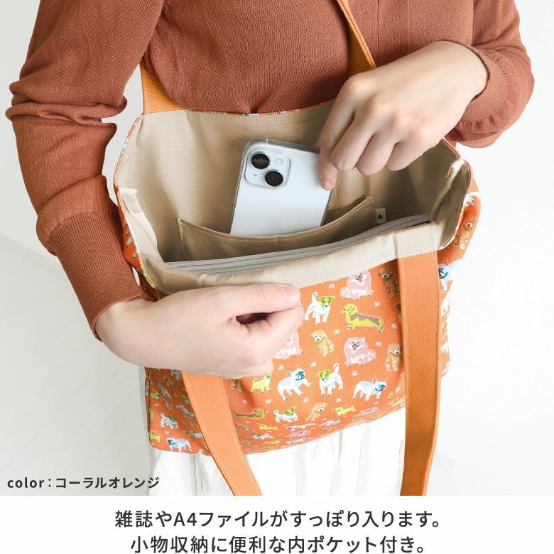 持っているだけで気分が上がる、犬のイラストがカラフルなトートバッグです。雑誌やA4ファイルがすっぽり入り、小物収納に便利な内ポケット付き。付属のがま口チャームは犬のおやつやごはんをイメージしたかわいいデザインです。