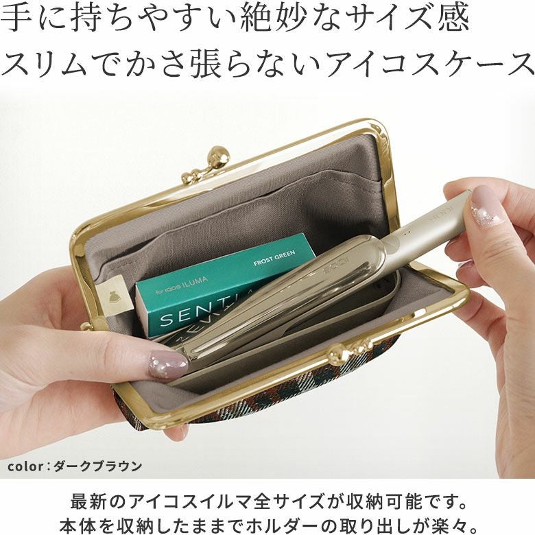 手に持ちやすい絶妙なサイズ感、スリムでかさ張らないアイコスケース。 アイコスユーザーのスタッフが発案した、アイコスを横向きに収納するタイプのアイコスケースです。 本体を収納したままでホルダーの取り出しができるので便利です。 シガレットケースだけじゃなく、コスメなどの小物を収納するポーチとしても大活躍。プレゼントとしてもちょうど良いサイズ感なのでおすすめです。 >納期についてのご案内 備考 ※デリケートな生地を使用しているので、ひっかかりなどにご注意ください。※生地の裁断により柄の出方は一点一点異なります。柄の指定は受け付けておりません。※商品の仕様や価格は予告なく変更する場合があります。※がま口はその特性上、荷物の大きさや重さで強い力が加わると口金が開きやすくなります。※内寸外寸ともに実寸で表記しています。※生地の種類によって表記のサイズと誤差が生じる場合があります。※置いた状態で測っているので多少の誤差があります。※手づくりのため個体差があります。 あらかじめご了承ください。 販売期間 「在庫限り・再入荷の予定なし」数量限定生産品のため売り切れ次第販売終了となります。また各種オーダーの対象外です。 サイズ詳細 <本体> 外寸:高さ11.5cm、幅14cm、マチ4cm 内寸:高さ10cm、幅12.5cm 内ポケット:高さ7cm、幅12.5cm <重さ> 65g ※外寸は口金を含みます。※内寸は口金を含みません。 素材 <袋> 表地:シルク80%・ポリエステル20%、裏地:綿100% <口金> 鉄(ゴールド) 製造 日本製(京都秀和がま口製作所) お支払方法 クレジットカード/コンビニ後払い/Amazon Pay/楽天ペイ/PayPayクレジットカード決済、Amazon Pay、PayPay、楽天ペイをご選択の場合、システムの都合上、商品発送前にご請求させて頂く場合がございます。何卒ご了承下さいますようお願い申し上げます。規約に基づき返品、キャンセルもお受付できます。 発送方法 ゆうパケット:全国一律330円 2個までなら発送可能 ゆうパック:全国一律770円 日時指定可能 ※10,000円以上ご購入頂いた場合は送料無料になります。 商品説明 手に持ちやすい絶妙なサイズ感、スリムでかさ張らないアイコスケース。 アイコスユーザーのスタッフが発案した、アイコスを横向きに収納するタイプのアイコスケースです。 本体を収納したままでホルダーの取り出しができるので便利です。 シガレットケースだけじゃなく、コスメなどの小物を収納するポーチとしても大活躍。プレゼントとしてもちょうど良いサイズ感なのでおすすめです。 SERIES:ディアタータン ほどよいトラッド感、AYANOKOJIのチェック柄。 糸や配色にこだわったAYANOKOJIオリジナルデザインで可愛らしい色合いに心躍るチェック柄です。 太さや色の濃淡が不揃いなネップ糸で織った生地で、ふっくらとした立体感のナチュラルな風合いです。 STAFF VOICE アイコスユーザー×商品企画×縫製の企画チームが試行錯誤して作った、女性の手に収まりやすいサイズ感のがま口アイコスケース(スマートタイプ)です。最新のアイコスイルマ全サイズが収納可能です。紙巻きたばこ用のシガレットケースとしても使えます。ボックスタイプは横向きにして1箱、ソフトパックなら、2箱が縦向きに収納可能。※ソフトパックを2箱入れた場合、口金を閉じた時に多少、角張ります。※ボックスタイプは約10.1×5.5×2.3cm、ソフトパックは約8.8×5.5×2.3cmとして計測しています。 鞄にすっぽり収まるコンパクトなポーチをお探しの方にもおすすめなサイズ感で、リップやマスカラ、小さな鏡など、普段の持ち運び用のポーチにピッタリです。 IQOS アイコス イルマ 3 DUO スタンダードモデル シガレット ケース タバコ たばこ レディース メンズ ユニセックス バッグイン コスメ 化粧品 小物 収納 チェック タータン かわいい 柄 女性が 喜ぶ 喜ばれる プレゼント もらって 嬉しい ちょっと 良いもの いいもの ちょい足し プラスワン ギフト おすすめ 日本製 京都 ガマグチ がまぐち