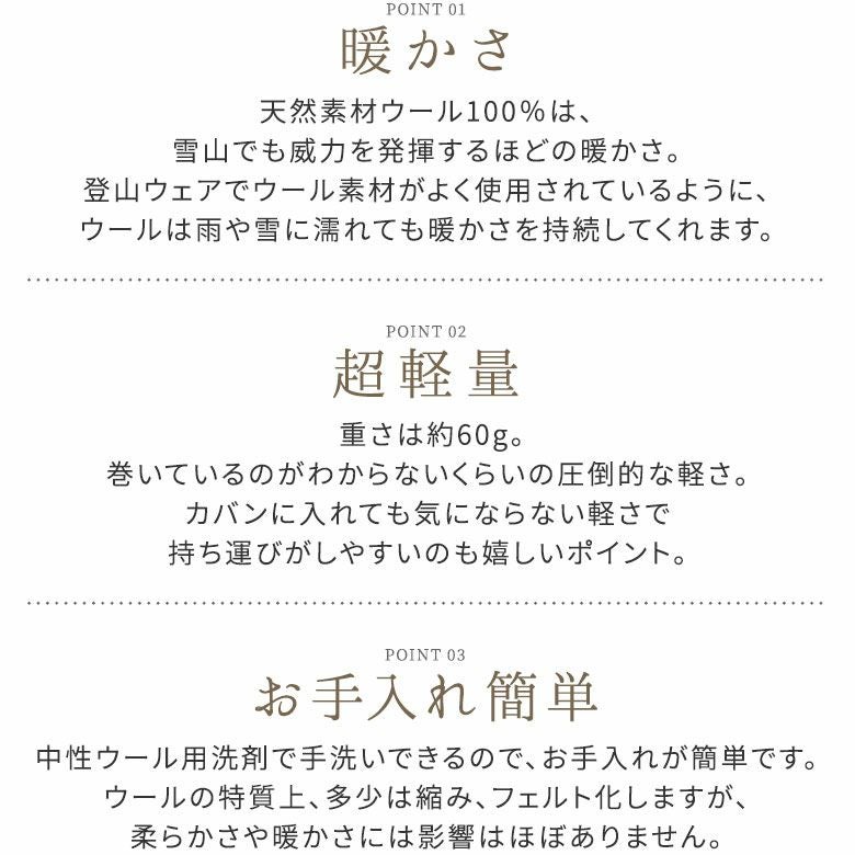薄手なのに暖か。かさ張らないウールマフラー。 日本製の上質なウール素材に一枚ずつ独特な染加工を施したウールマフラーです。 水に濡れても暖かさを持続する機能的な生地で、普段使いはもちろん、アウトドアなどにも様々なシュチュエーションで使えます。 >納期についてのご案内 備考 ※生地の性質を100%感じていただくために、あえて端縫いは施しておりませんので、最初は1センチほど、ほつれる場合があります。ほつれた場合は、その糸を抜いていただくか、途中で切ってください。 ※お洗濯はドライクリーニングか中性洗剤にて手洗いをおすすめします。手洗いの際の洗剤の量の目安は、洗面器一杯の水またはお湯に2~3滴です。手洗い後、多少生地が縮みフェルト化しますが、元々間隔を開けて織り上げている生地なので、ほどよく締まってきます。 ※染め物につき、フェルト化が進むと柄がぼやける場合があります。 ※色落ちはほとんどしませんが、最初のうちは白いものと一緒の洗濯はお避けください。 ※アイロンをかける際は中温でおかけください。 あらかじめご了承ください。 販売期間 「在庫限り・再入荷の予定なし」数量限定生産品のため売り切れ次第販売終了となります。また各種オーダーの対象外です。 サイズ詳細 <本体> 165×35cm ※商品サイズの表記はおおよその値となります。 素材 ウール100% 製造 日本製(禾口木丙(のぎぐちきへい)) お支払方法 クレジットカード/コンビニ後払い/Amazon Pay/楽天ペイ/PayPayクレジットカード決済、Amazon Pay、PayPay、楽天ペイをご選択の場合、システムの都合上、商品発送前にご請求させて頂く場合がございます。何卒ご了承下さいますようお願い申し上げます。規約に基づき返品、キャンセルもお受付できます。 発送方法 ゆうパケット:全国一律330円 1個までなら発送可能 ゆうパック:全国一律770円 日時指定可能 ※10,000円以上ご購入頂いた場合は送料無料になります。 商品説明 薄手なのに暖か。かさ張らないウールマフラー。 日本製の上質なウール素材に一枚ずつ独特な染加工を施したウールマフラーです。水に濡れても暖かさを持続する機能的な生地で、普段使いはもちろん、アウトドアなどにも様々なシュチュエーションで使えます。 POINT1 暖かさ 天然素材ウール100%は、雪山でも威力を発揮するほどの暖かさです。登山ウェアでウール素材がよく使用されているように、ウールは雨や雪に濡れても暖かさを持続してくれます。 POINT2 超軽量 重さは約60g。巻いているのがわからないくらいの圧倒的な軽さ。カバンに入れても気にならない軽さで持ち運びがしやすいのも嬉しいポイント。 POINT3 お手入れ簡単 中性ウール用洗剤で手洗いできるので、お手入れが簡単です。ウールの特質上、多少は縮み、フェルト化しますが、柔らかさや暖かさには影響はほぼありません。 <注意点> ・生地の性質を100%感じていただくために、あえて端縫いは施しておりませんので、最初は1センチほど、ほつれる場合があります。ほつれた場合は、その糸を抜いていただくか、途中で切ってください。 ・お洗濯はドライクリーニングか中性洗剤にて手洗いをおすすめします。手洗いの際の洗剤の量の目安は、洗面器一杯の水またはお湯に2~3滴です。手洗い後、多少生地が縮みフェルト化しますが、元々間隔を開けて織り上げている生地なので、ほどよく締まってきます。 ・染め物につき、フェルト化が進むと柄がぼやける場合があります。 ・色落ちはほとんどしませんが、最初のうちは白いものと一緒の洗濯はお避けください。 ・アイロンをかける際は中温でおかけください。