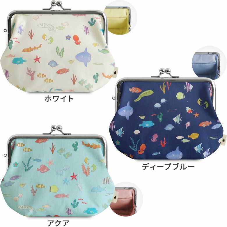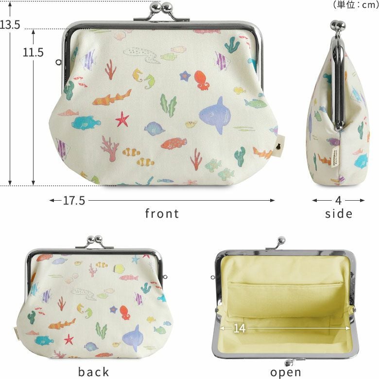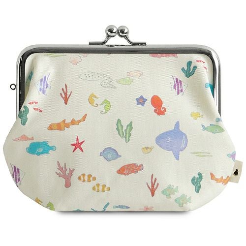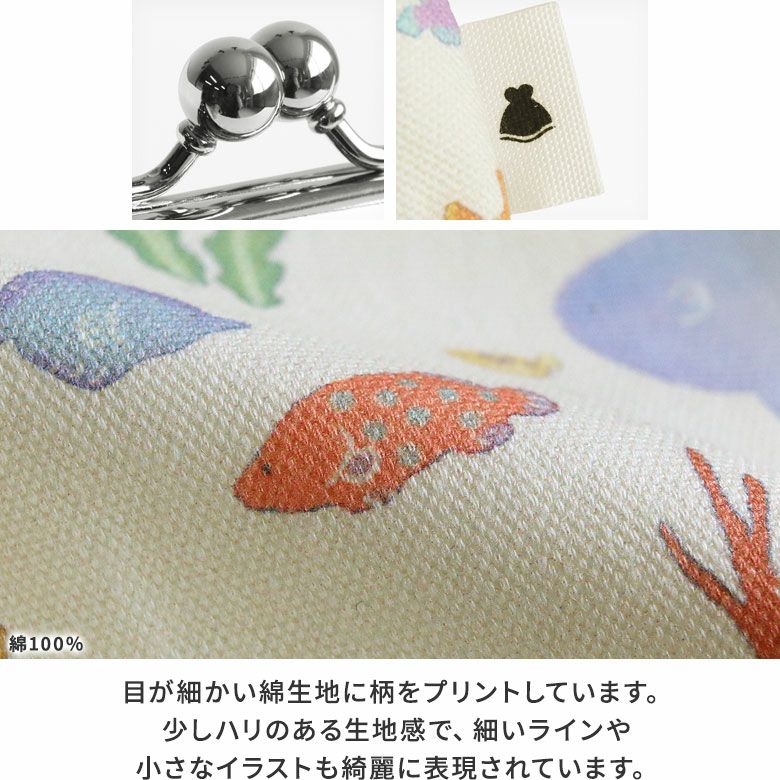 バッグインにちょうど良い、マチ幅スッキリポーチ。 スリムなマチ幅で持ちやすく、ちょうど良いベーシックな大きさ感の5寸がま口スッキリポーチです。 >納期についてのご案内 備考 ※商品の仕様、価格は予告なく変更する場合があります。 ※がま口はその特性上、荷物の大きさや重さで強い力が加わると口金が開きやすくなります。 ※内寸、外寸ともに実寸で表記しています。※置いた状態で測っているので多少の誤差が生じる場合があります。※手づくりのため、細かな個体差があります。※生地の厚みや素材によって表記のサイズと多少の誤差が生じる場合があります。※生地の裁断により柄の出方は一点一点異なります。柄の指定は受け付けておりません。 あらかじめご了承ください。 販売期間 「在庫限り・再入荷の予定なし」数量限定生産品のため売り切れ次第販売終了となります。また各種オーダーの対象外です。 サイズ詳細 <本体> 外寸:高さ13.5cm、幅17.5cm、マチ4cm 内寸:高さ11.5cm、幅14cm 内ポケット:高さ7cm、幅13.5cm <重さ> 95g ※商品サイズの表記はおおよその値となります。 ※外寸は口金を含みます。 ※内寸は口金を含みません。 素材 <袋> 表地:綿100%、裏地:レーヨン100% <口金> 鉄(シルバー) 製造 日本製(京都秀和がま口製作所) お支払方法 クレジットカード/コンビニ後払い/Amazon Pay/楽天ペイ/PayPayクレジットカード決済、Amazon Pay、PayPay、楽天ペイをご選択の場合、システムの都合上、商品発送前にご請求させて頂く場合がございます。何卒ご了承下さいますようお願い申し上げます。規約に基づき返品、キャンセルもお受付できます。 発送方法 ゆうパケット:全国一律330円 2個までなら発送可能 ゆうパック:全国一律770円 日時指定可能 ※10,000円以上ご購入頂いた場合は送料無料になります。 商品説明 バッグインにちょうど良い、マチ幅スッキリポーチ。 スリムなマチ幅で持ちやすく、ちょうど良いベーシックな大きさ感の5寸がま口スッキリポーチです。 スリムなマチ幅なので、小さめのバッグやビジネスバッグなどの薄型バッグの中でもかさ張りません。 コスメやアクセサリーなどの小物の小分けに便利な内ポケットが付いています。小分けが難しい大き目バッグのバッグインにもおすすめです。 SERIES 夏といえば海。水族館の中をイメージして海に生きる植物や動物のゆるかわな絵柄に癒される「うみのいきもの」シリーズ。たくさんの海の生き物たちの自由な様子を表現しました。爽やかなマリンカラーで可愛らしいテイスト。小物を中心に、色柄豊富なラインナップです。※アイテムによって生地の素材・展開カラーが異なります。 目が細かい綿生地に柄をプリントしています。少しハリのある生地感で、細いラインや小さなイラストも綺麗に表現されています。 ポーチ レディース スリム 薄型 コンパクト 使いやすい バッグイン コスメ 化粧品 小物 収納 海 魚 熱帯魚 生物 女性が 喜ぶ 喜ばれる プレゼント もらって 嬉しい ちょっと 良いもの いいもの 日本製 京都 ガマグチ がまぐち