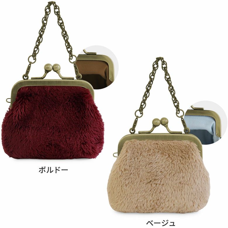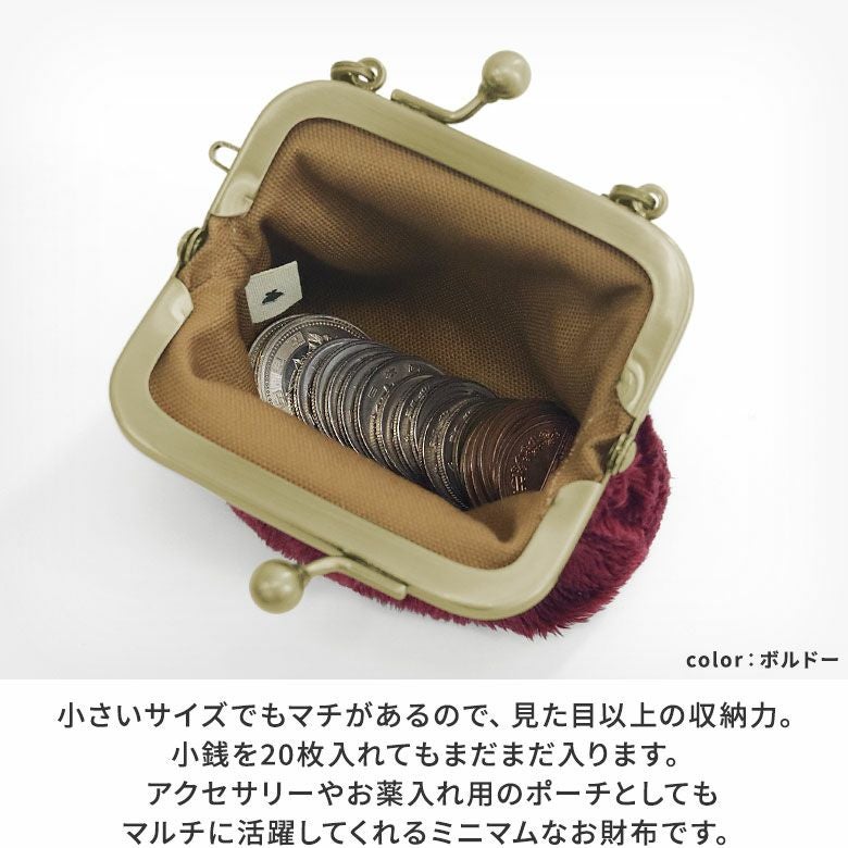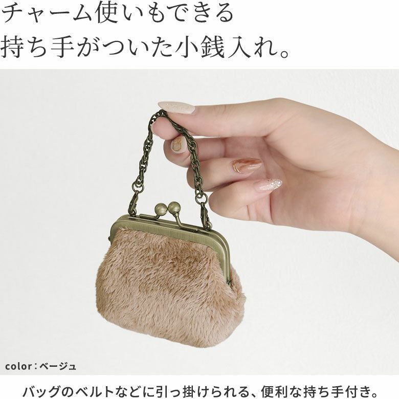 チャーム使いもできる、持ち手がついた小銭入れ。 小銭や小さなコスメ類、鍵など、こまごま収納にちょうど良い、持ち手付き手提げがま口財布(小)です。 【商品情報】 <在庫商品>お届けの目安:1~3営業日後に発送 詳細なお届け日はご注文確認後「受注確認メール」にてお知らせ致します。 ■納期についてのご案内 備考 デリケートな生地を使用しているので、ひっかかりなどにご注意ください。 ※がま口はその特性上、荷物の大きさや重さで強い力が加わると口金が開きやすくなります。 あらかじめご了承ください。 販売期間 「在庫限り・再入荷の予定なし」数量限定生産品のため売り切れ次第販売終了となります。また各種オーダーの対象外です。 サイズ詳細 <本体> 本体> 外寸:高さ8.5cm、幅8.5cm、マチ3cm 内寸:高さ6cm、幅5.8cm <持ち手> 幅5mm、長さ14cm(パーツ含む) <重さ> 40g(持ち手含む) ※商品サイズの表記はおおよその値となります。 使用可能なアイテム ・手提げ用 14cmレザー角ヒモ(茶色巻き)- NK/AG・手提げ用 14cmチェーン AGのみ 素材 <袋> 表地:ポリエステル100% サブ生地:綿100% 裏地:綿100% <口金> 鉄(アンティークゴールド) 製造 日本製(京都秀和がま口製作所) お支払方法 クレジットカード/コンビニ後払い/Amazon Pay/楽天ペイ/PayPayクレジットカード決済、Amazon Pay、PayPay、楽天ペイをご選択の場合、システムの都合上、商品発送前にご請求させて頂く場合がございます。何卒ご了承下さいますようお願い申し上げます。規約に基づき返品、キャンセルもお受付できます。 発送方法 ゆうパケット:全国一律330円 4個までなら発送可能 ゆうパック:全国一律770円 日時指定可能 ※10,000円以上ご購入頂いた場合は送料無料になります。 商品説明 チャーム使いもできる、持ち手がついた小銭入れ。 小銭や小さなコスメ類、鍵など、こまごま収納にちょうど良い、持ち手付き手提げがま口財布(小)です。 ガバッと大きく開いて中が見やすく、小さいサイズでもマチがあるので、小銭を20枚入れてもまだまだ入る、見た目以上の収納力。 バッグのベルトなどに引っ掛けられる便利な持ち手付きで、アクセサリーやお薬入れ用のポーチとしてもマルチに活躍してくれるミニマムなお財布です。 MATERIAL ファー初心者さんでも取り入れやすい、短めの毛足のファーを使用。柔らかさと優しい手触りが特徴です。 COLOR ・ボルドー・ベージュ