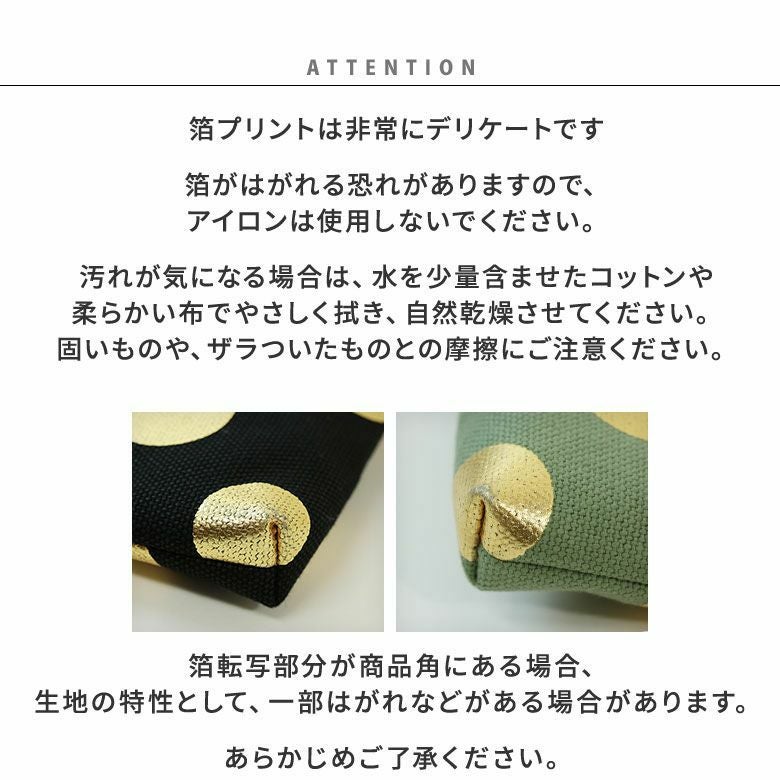 ・箔転写部分が商品角にある場合、一部はがれなどがある場合があります。生地の特性としてあらかじめご了承ください。
