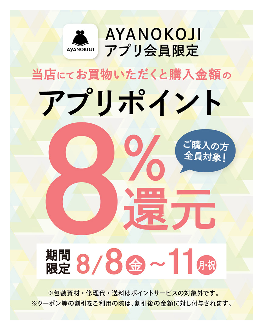 期間中にAYANOKOJI実店舗・オンラインショップ本店にて商品をご購入いただくと、アプリポイントを8%還元!ぜひこの機会にお買い物ください♪
