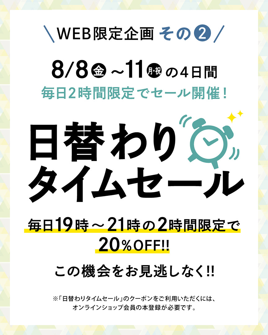 ※「日替わりタイムセール」のクーポンをご利用いただくには、オンラインショップ会員の本登録が必要です。