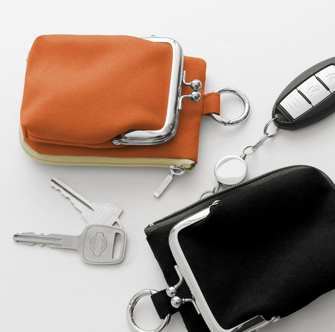 新型の「縦型がま口キーコインケース」は、L字ファスナーで出し入れしやすく、コンパクトなサイズ感。便利なカラビナ付きだから、色々な使い方ができます。