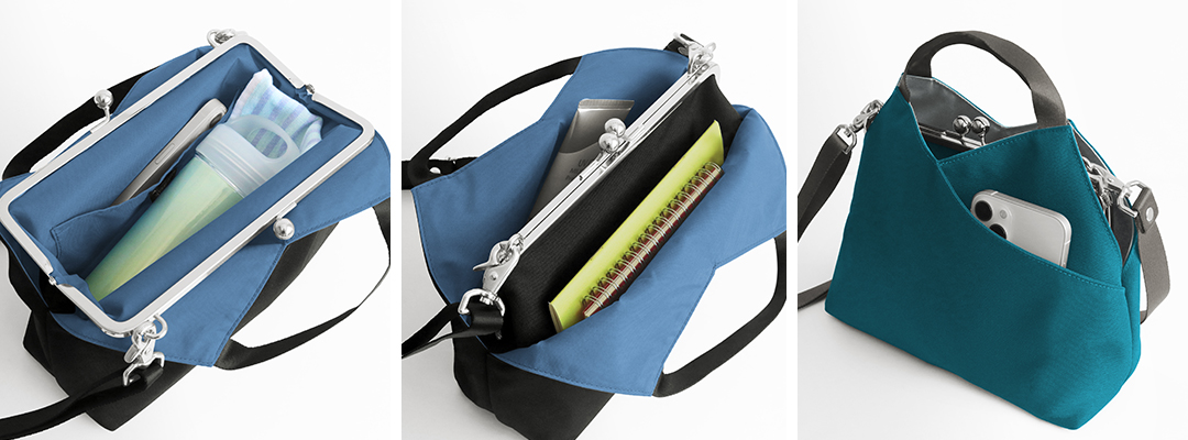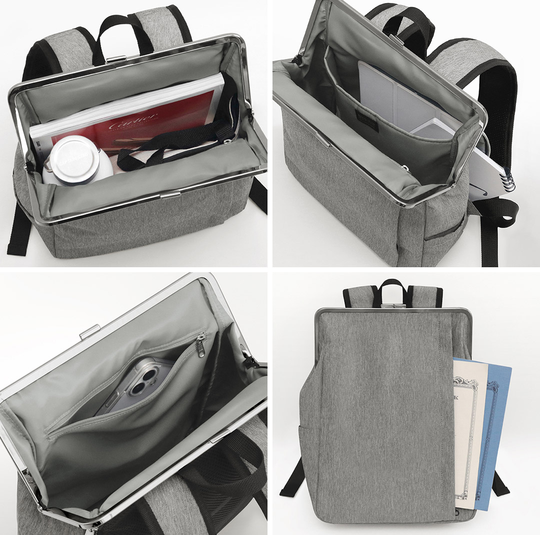 メインのがま口収納はA4サイズが入れられて、マチ幅もあるので背の高い500mlボトルやお弁当箱も収納できます。クッション性のあるポケットが付いており、サイドファスナーが貫通仕様になっています。前面側のファスナーポケットには、スマホや鍵などの貴重品が収納可能。外側前面には隠しファスナーポケットがあり、B5サイズが入れられます。