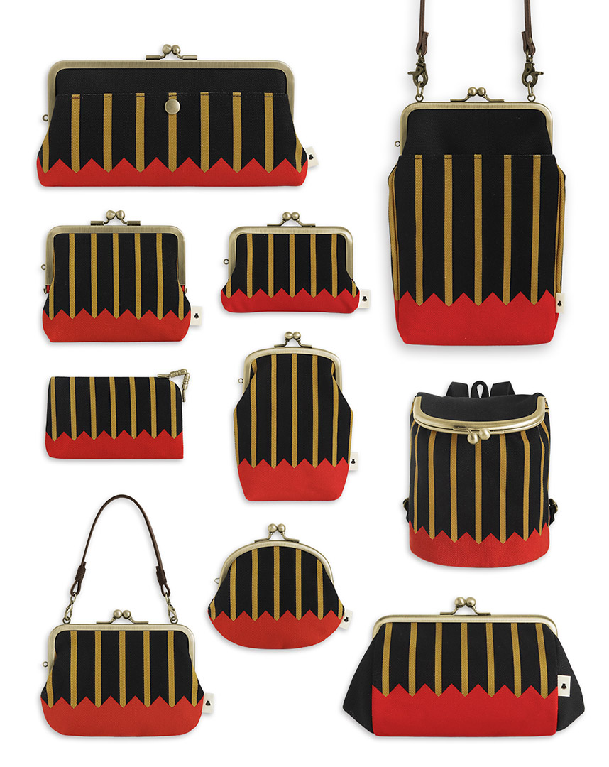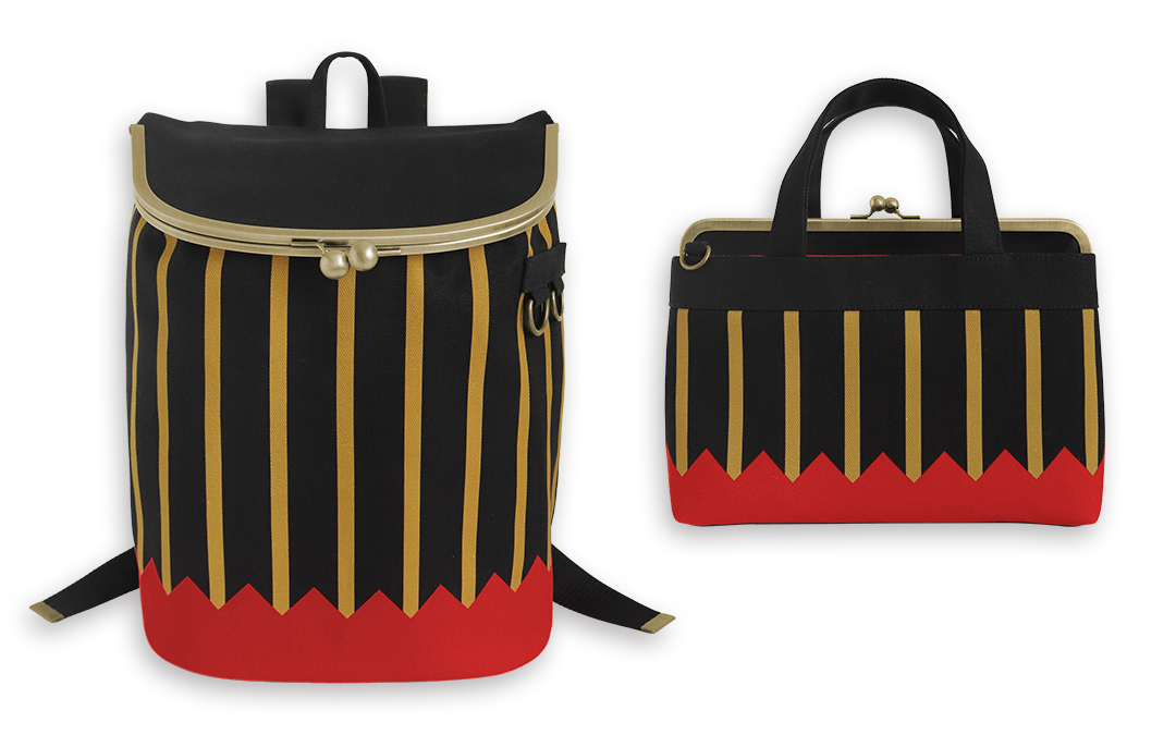 「山形文様陣羽織」をモチーフにした、黒地に縦縞と山形文様が映える潔いデザインがインパクトのあるシリーズ。「平親子がま口財布」は伊達ストライプでは初展開です。