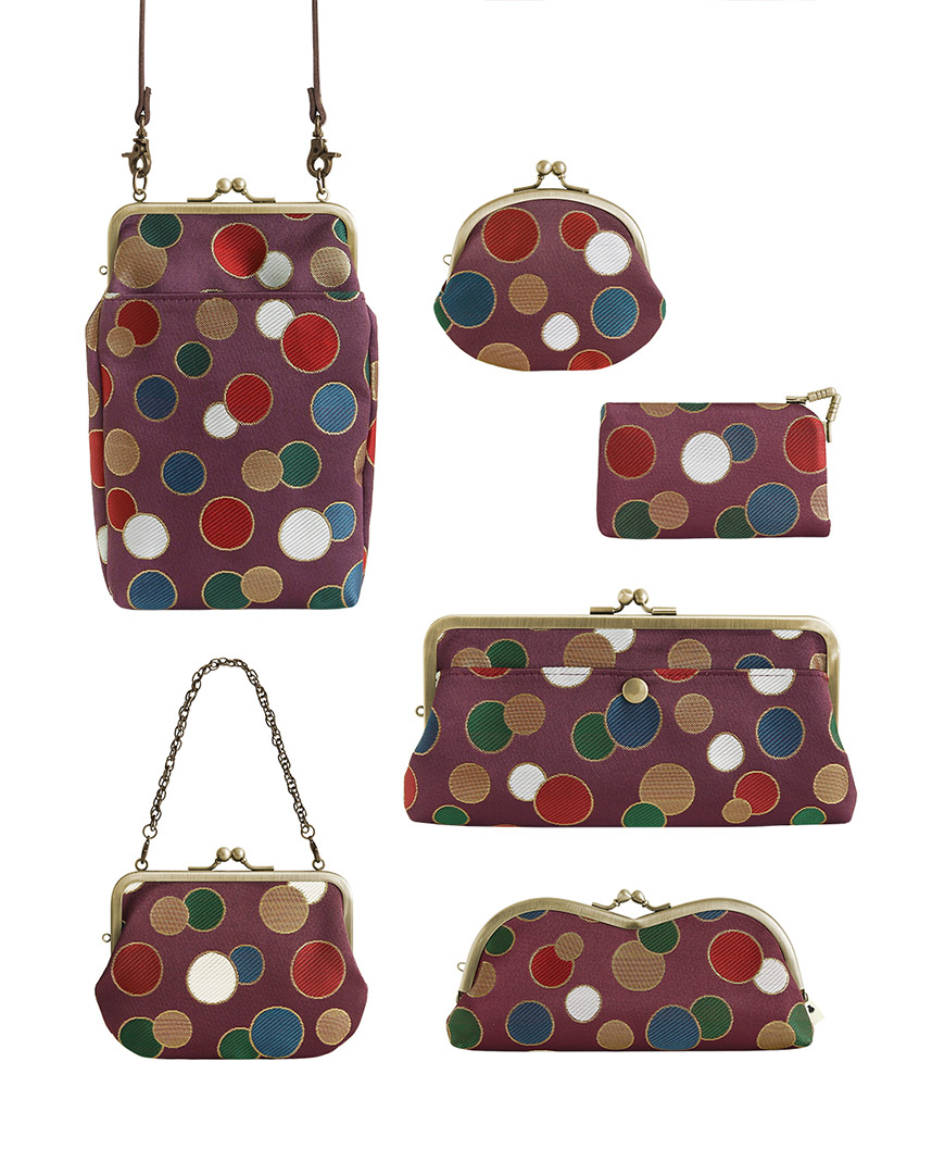 「水玉模様陣羽織」をモチーフに、カラフルなドット柄を深みのある紫地に金襴で表現したシリーズ。角度によって輝き方が変化する金襴生地が上品で鮮やかです。