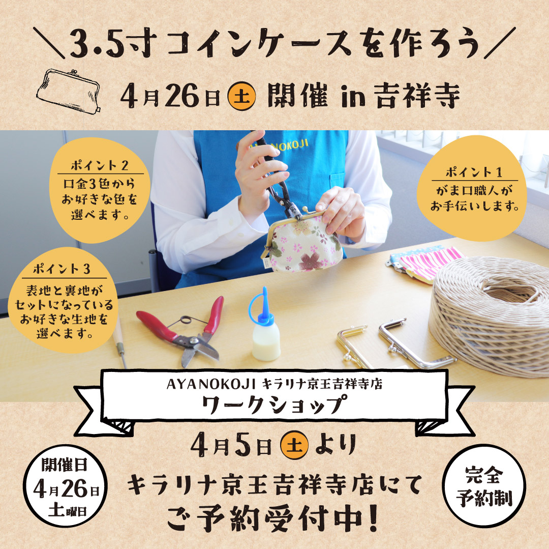 4月26日(土)、キラリナ京王吉祥寺店にて『3.5寸がま口コインケースを作ろう!ワークショップ』を開催します⭐手のひらサイズでコンパクトな「3.5寸がま口コインケース」)の口金入れを体験!職人が丁寧にレクチャーしますので初心者でも安心です♪