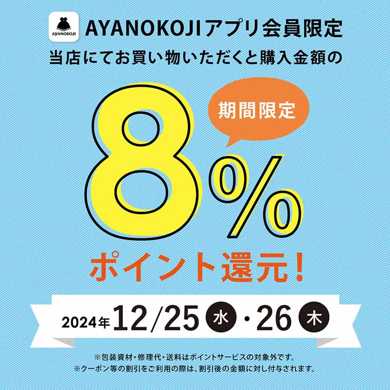 AYANOKOJIでは、公式アプリ会員様限定で2日間限りの特別キャンペーンを実施!全実店舗・オンラインショップ本店にて、全商品を対象に商品ご購入でアプリポイント8%還元!この機会にお財布を新調しちゃいましょう♪