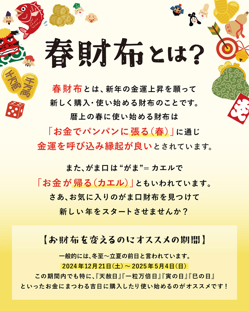 お金がいっぱいで“張る財布”と“春財布”を掛けて、春に財布を買い替えると金運を呼び込み縁起が良いとされています👛