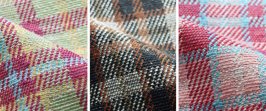 糸や配色にこだわったAYANOKOJIのオリジナルテキスタイルを使用。太さや色の濃淡が不均一な意匠糸で、ナチュラルな風合いに仕上がっています。ピンク・イエロー・ダークブラウンの3色展開。