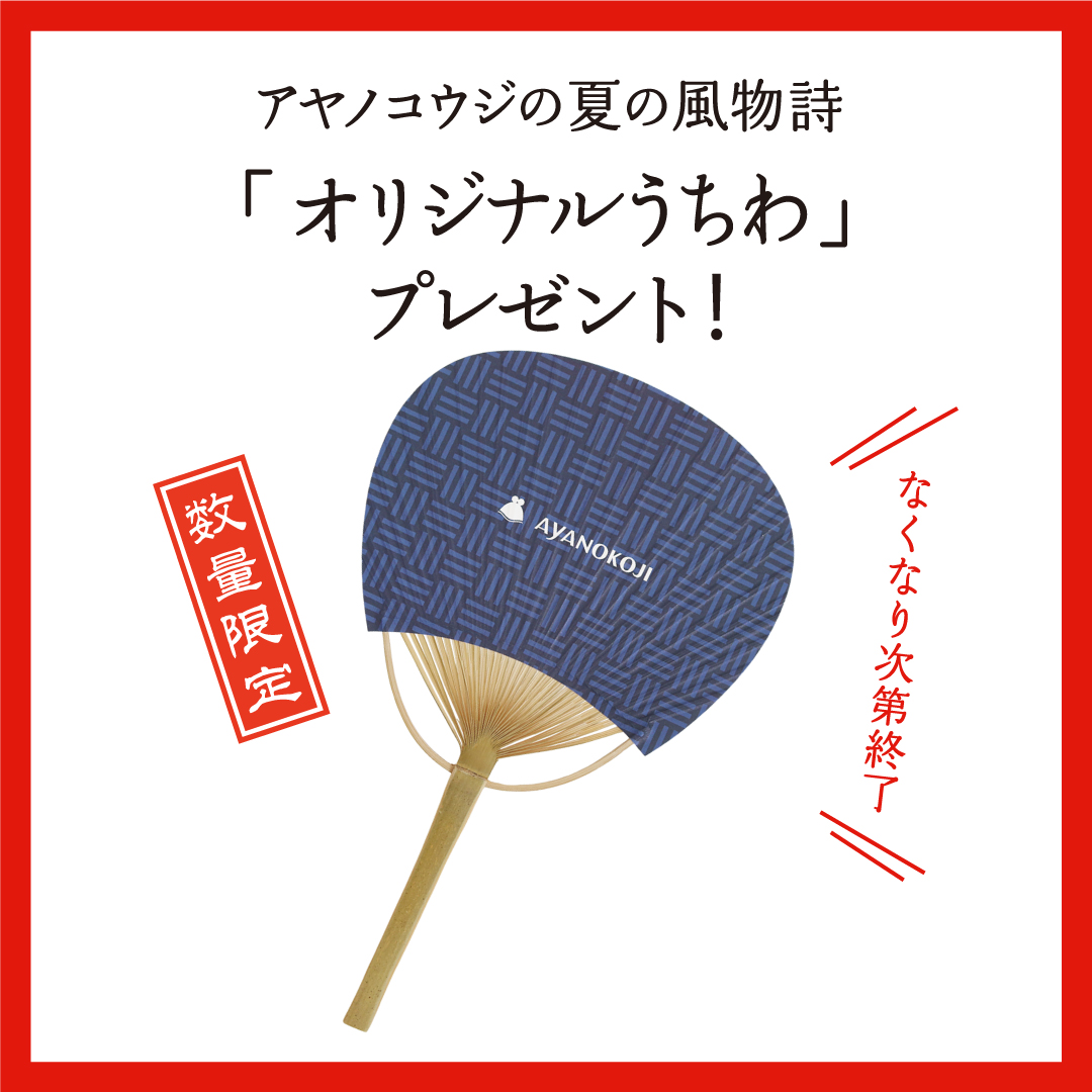 7月13日(土)から、AYANOKOJIの全実店舗・オンラインショップ本店にて先着で「オリジナルうちわ」を1本プレゼント!実店舗とオンラインショップで条件が異なりますので、ご確認のうえゲットしてください⭐