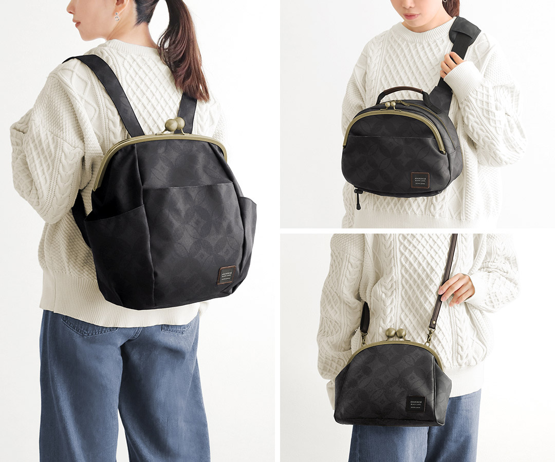 がまぽちゃリュック ¥23,100 / がま口ポシェット型ボディバッグ ¥20,900 / 大玉がま口ポシェット ¥12,100