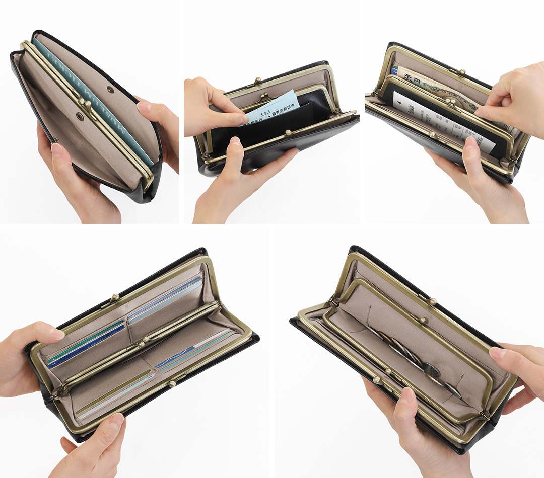 たっぷり収納できる親子がま口タイプの長財布です。両外側にスナップボタン付きの大きなポケットがあり、レシートやチケットなどを収納可能。がま口の中の子がま口にも両側面にポケットが付いています。子がま口を挟んだ両側には、ぞれぞれ4つずつのカードポケットとフリーポケットがあり、お札やレシートも入れられます。小銭が入れられる子がま口は大きく開いて中が見えやすくなっています。