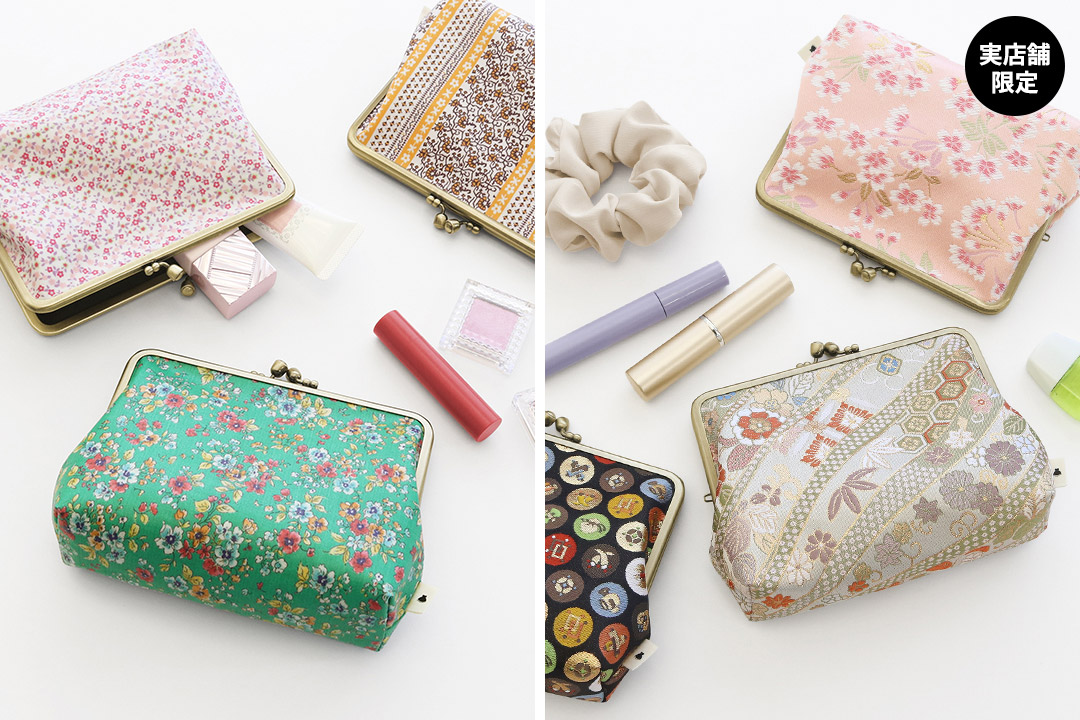 がま口KAKU型ポーチ:花柄PVC ¥1,980 / 金襴 ¥2,750【実店舗限定】