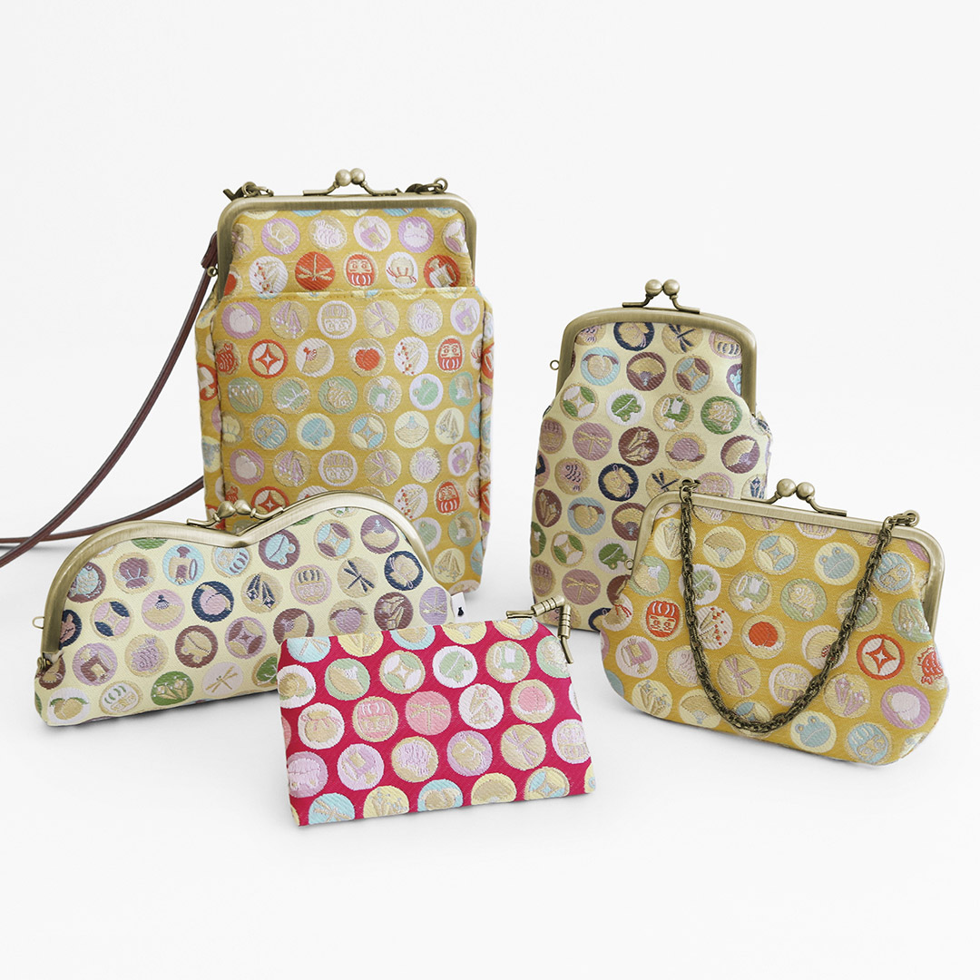かえるや七宝、だるまなど、縁起の良いモチーフを取り入れたオリジナルデザインを、金糸を使ったジャガード生地に仕上げたシリーズ。ソフトな色合いにキラキラ輝く金糸が絶妙にマッチした、華やかな黄金色・鳥の子色・桃紅色の3色展開です。幸運を運んでくれそうな縁起の良い柄で、プレゼントにもおすすめ。