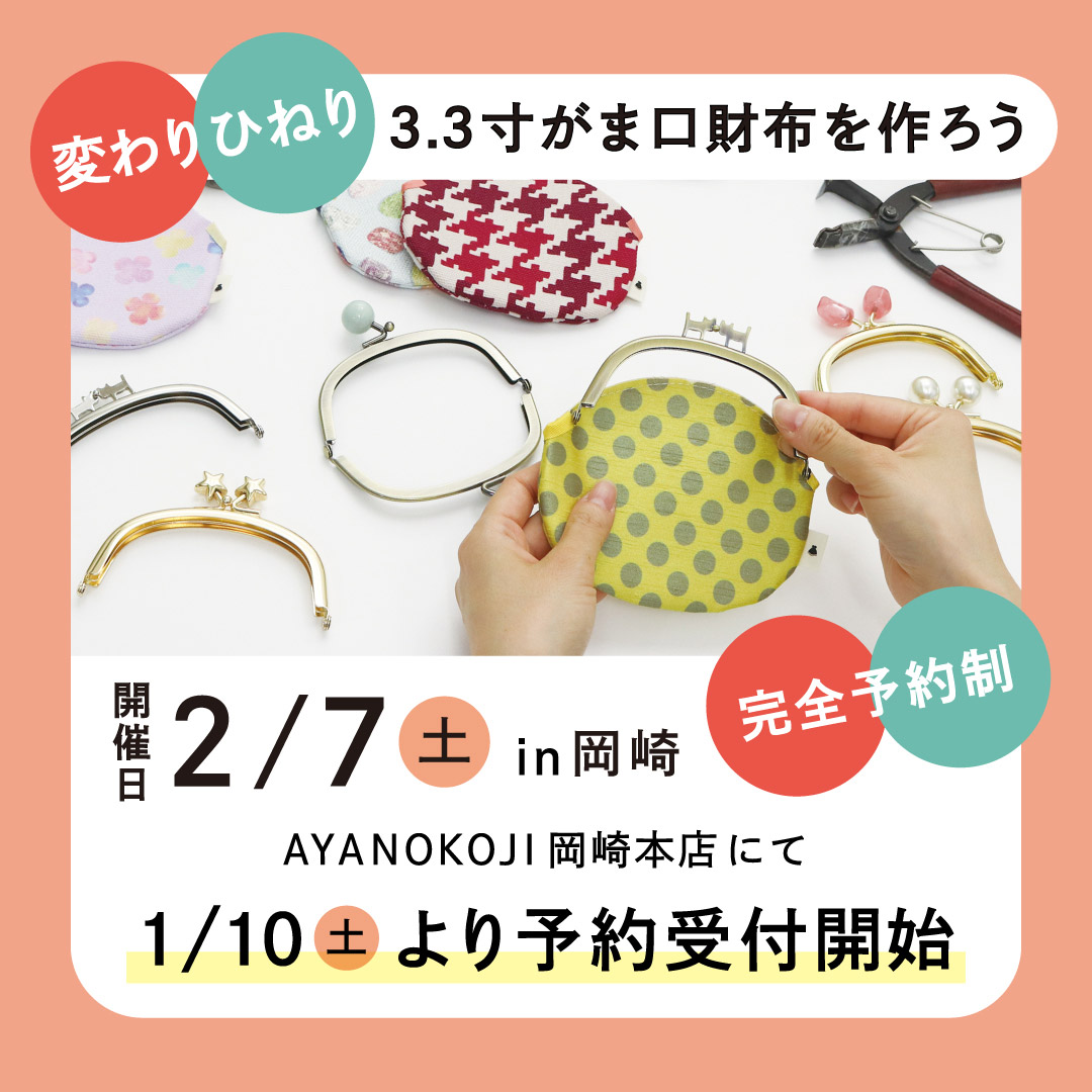 2月7日(土)、岡崎本店にてワークショップ『変わりひねり3.3寸がま口財布を作ろう!』を開催します⭐珍しいひねり玉が付いた口金であなただけのオリジナルがま口が作れます!職人が丁寧にレクチャーしますので初心者でも安心です♪