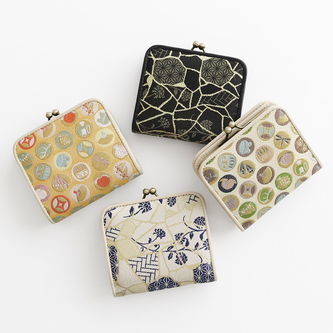上品なジャガード生地を使用した二つ折りのミニ財布。実店舗・オンラインショップで販売中。