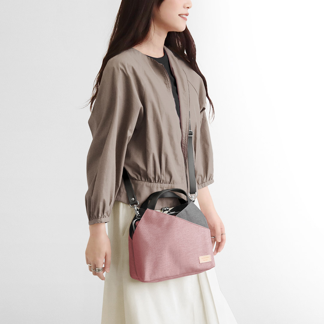 高強力の特殊加工糸(ATY)を使用した摩擦に強い機能性素材「MONTANA」シリーズの限定カラーのがま口レイヤードショルダーバッグが登場!ふんわり優しいピンクをメインに、グレーをサブ生地に使用したバイカラー仕様です。