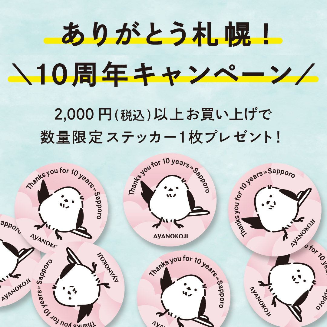 さっぽろ東急百貨店にて商品を2,000円(税込)以上ご購入いただいた方に、先着で「ステッカー」を1枚プレゼント!10周年限定のオリジナルデザインです。なくなり次第終了となりますので、ぜひお早めにゲットしてください♪