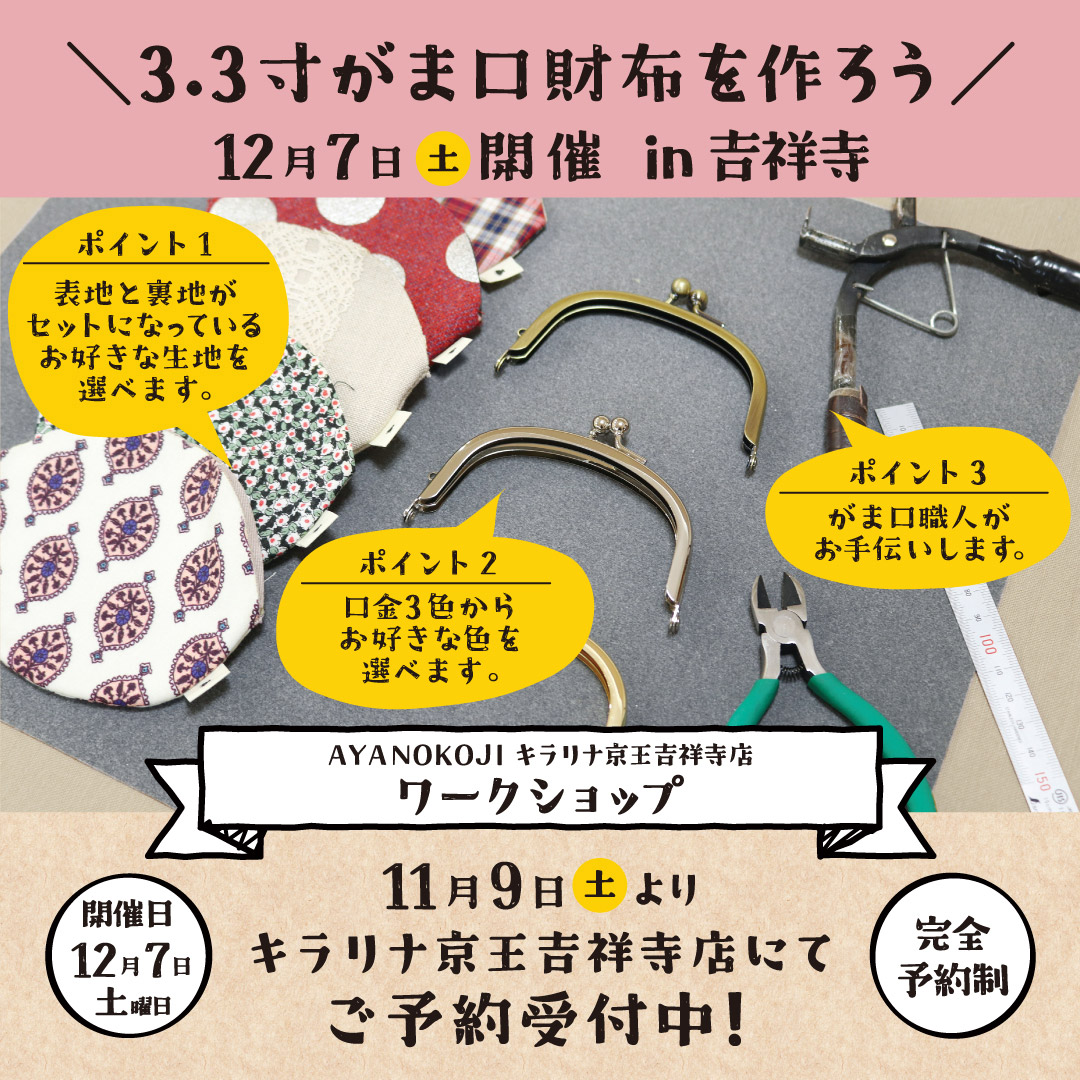 12月7日(土)、キラリナ京王吉祥寺店にて『3.3寸がま口財布を作ろう!ワークショップ』を開催します⭐シンプルな丸い形がかわいい「3.3寸がま口財布」の口金入れを体験!職人が丁寧にレクチャーしますので初心者でも安心です♪