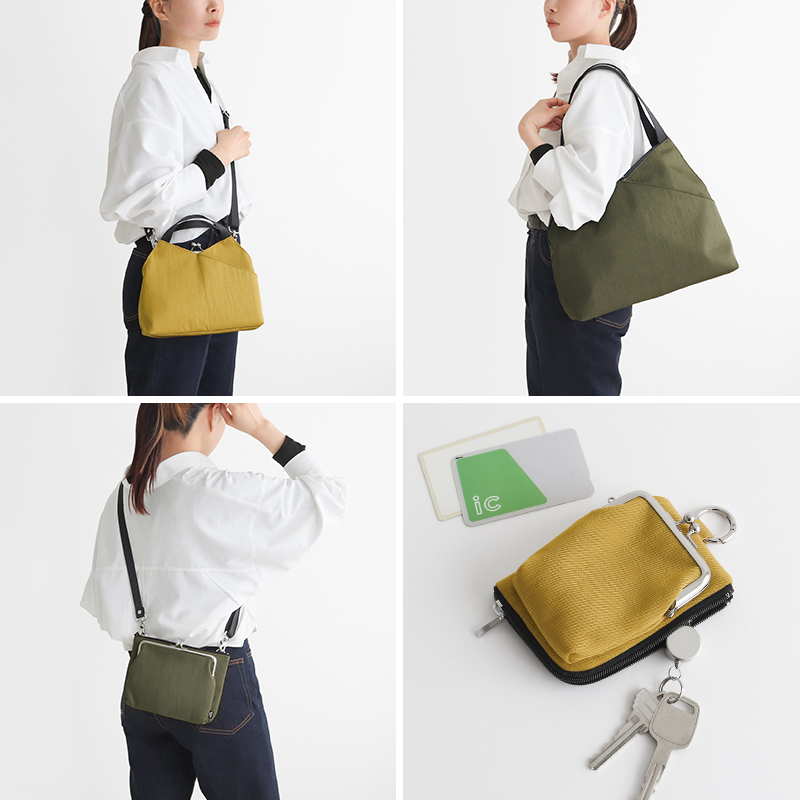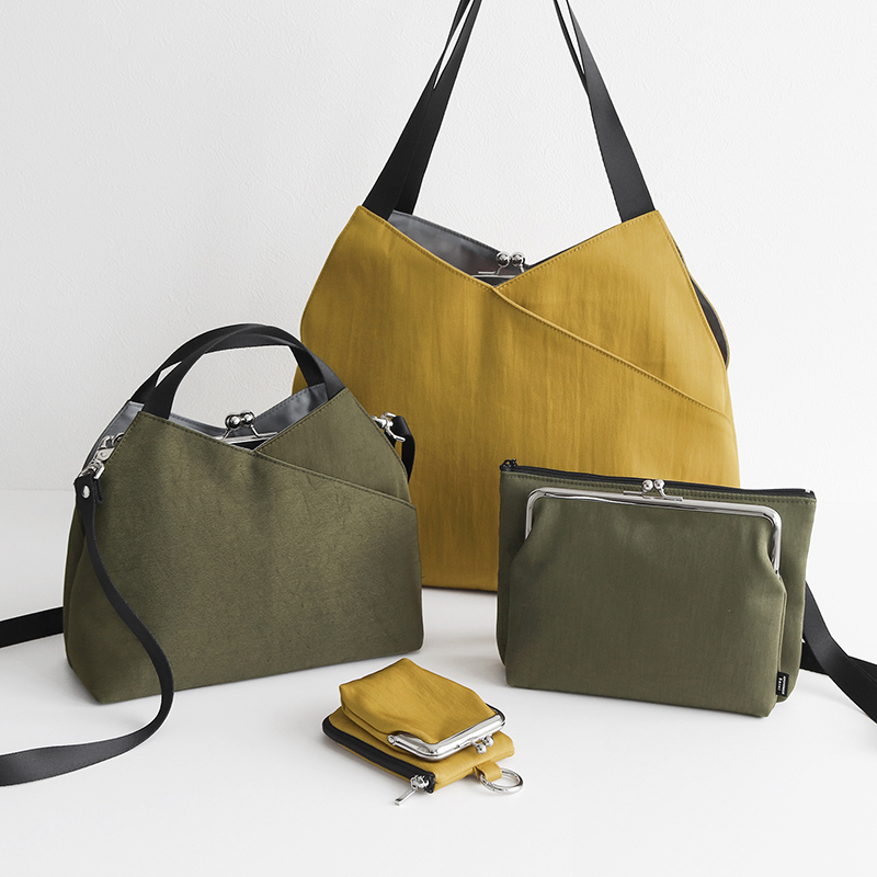 がま口レイヤートート ¥16,500 / がま口レイヤードショルダーバッグ ¥13,200 / がま口ポケット付きミニサコッシュ ¥8,470 / 縦型がま口キーコインケース ¥5,940