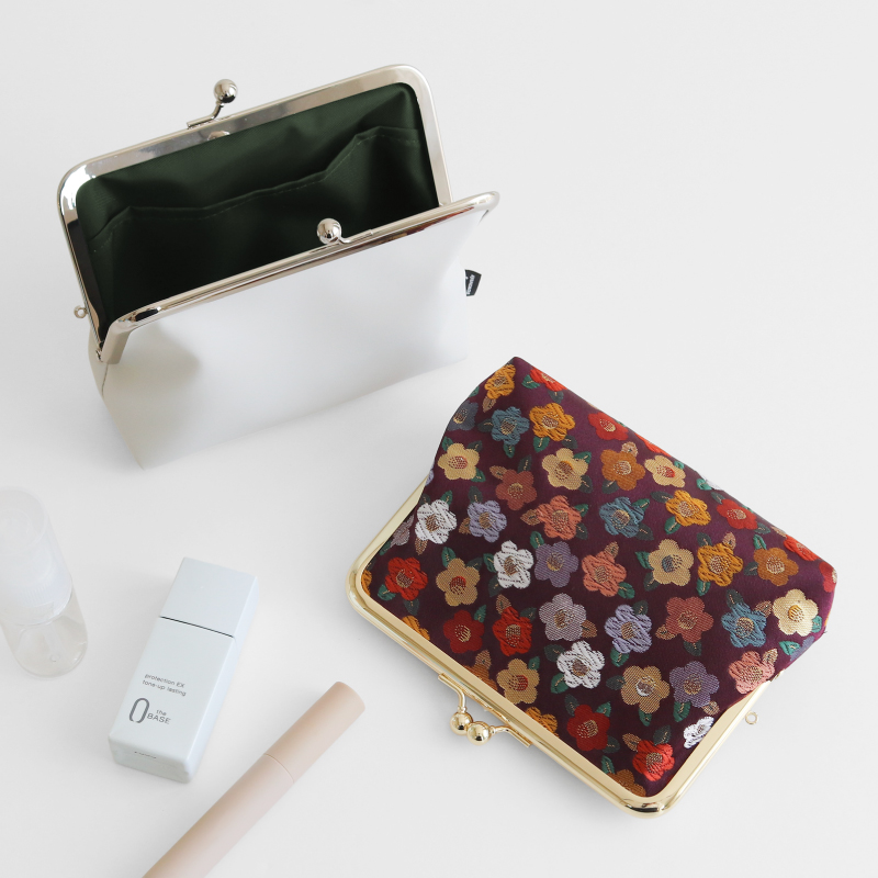 大きく開いてたくさん入る、ミドルサイズのポーチ。マチ幅が5cmあり、口金が大きく開くタイプなので中がとても見やすいです。小さなボトルなどは立てて入れられて、コスメや衛生用品、ガジェット類の収納におすすめ。仕分けに便利な深さのある内ポケットも付いています。