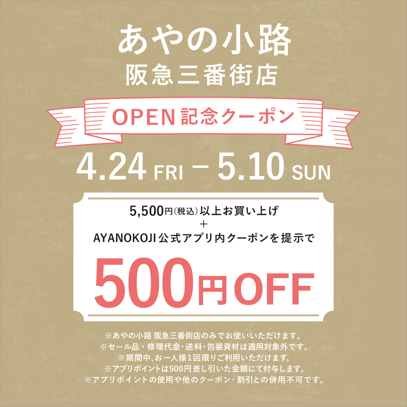あやの小路 阪急三番街店にて、期間中5,500円(税込)以上お買い上げいただくと、アプリの500円OFFクーポンをご利用いただけます!ぜひこの機会にお買い物ください♪