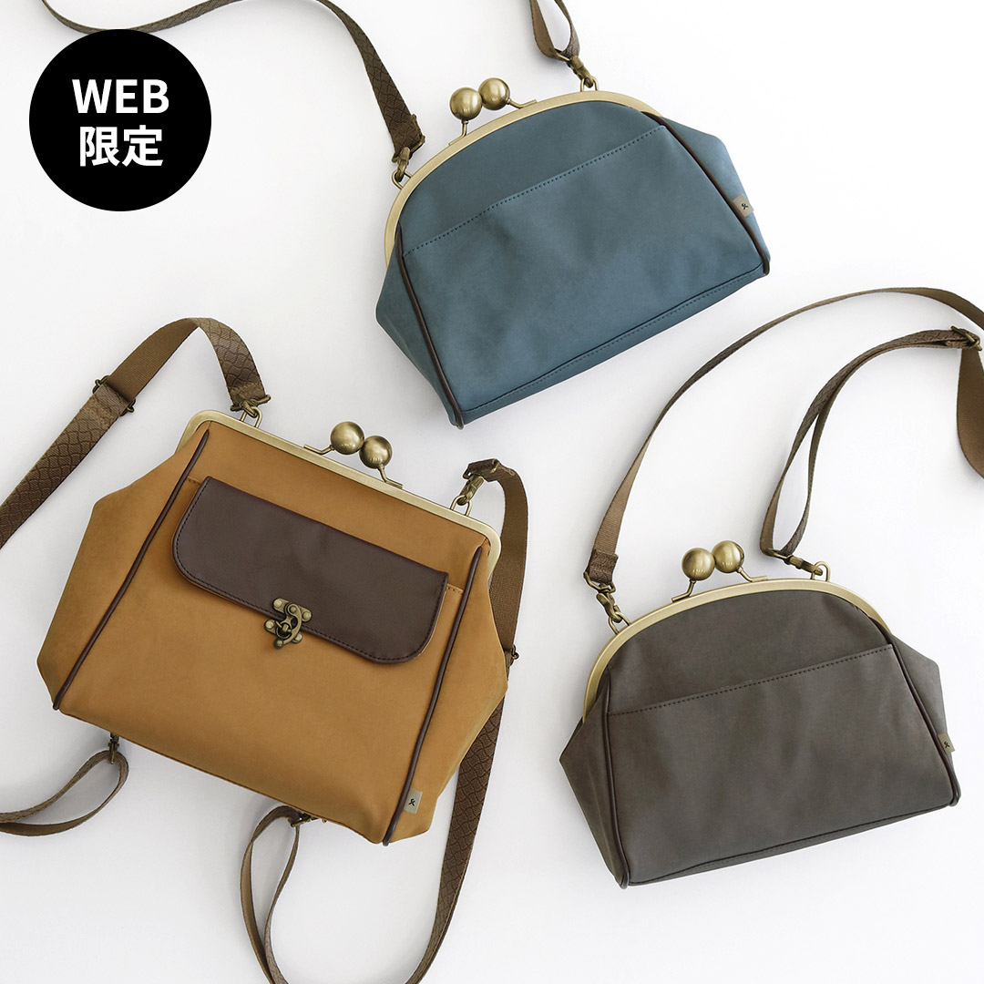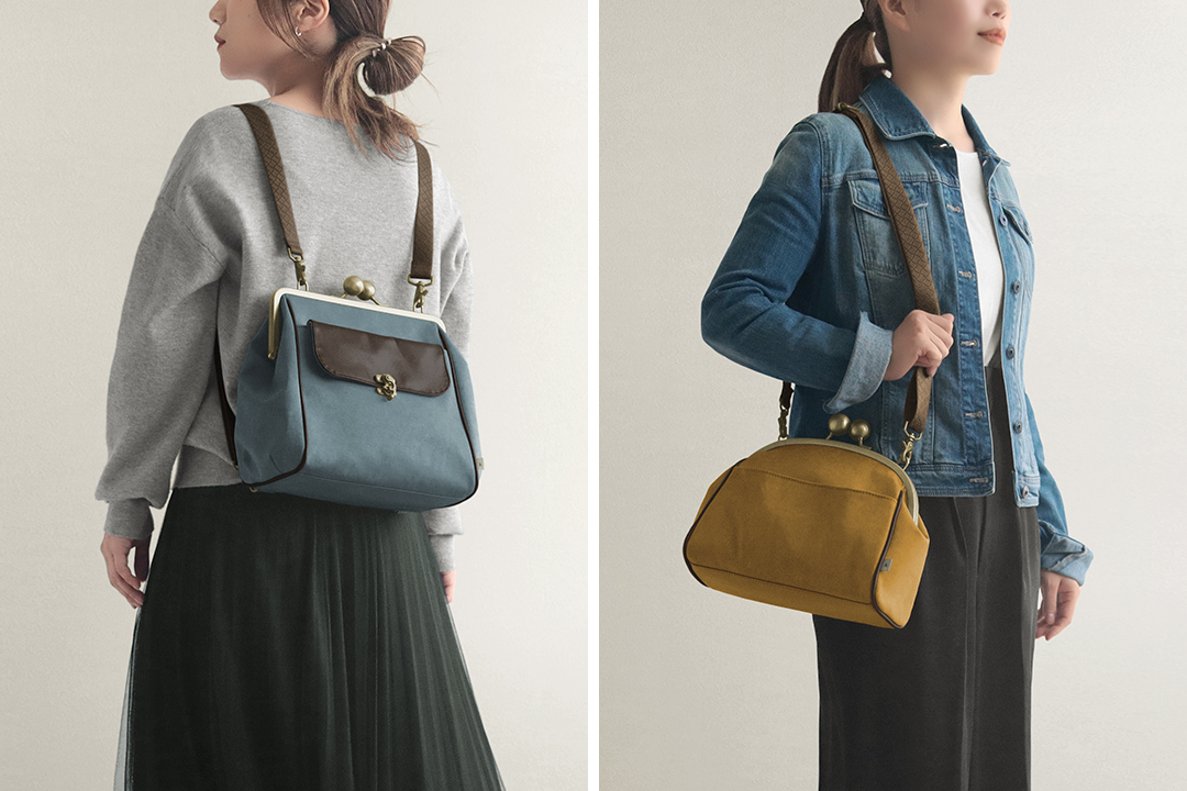 がま口フラップ2WAYリュック(大玉ひねり) ¥26,400 / 外ポケット付き大玉がま口ポシェット ¥15,400