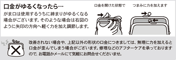 がま口は、開け閉めを繰り返すことで手応えが軽くなる性質があります。"大玉"の場合は、ふたつの「ひねり玉」を両手で包むように押し込んで閉めると、ひねり玉同士がスムーズに動きやすくなる場合がありますのでお試しください。