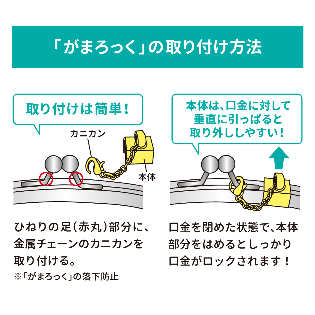 閉めた状態の口金に「がまろっく」を取り付ければ、がま口が勝手に開くのを防ぎ、防犯の役割も果たしてくれる優れモノです。