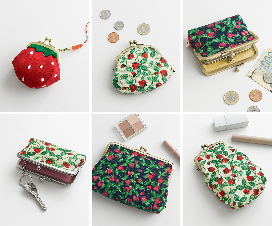 ころりんいちごチャーム ¥2,365 / 3.3寸がま口財布 ¥2,365 / たて型がま口小物入れ ¥2,585 / がま口キー&パスケース ¥3,190 / 6寸がま口平ポーチ(マチ有) ¥3,960 / 平親子がま口財布 ¥4,455 / フラップ付き大玉がま口ポシェット ¥14,300 / がま口リバーシブルトート ¥15,400