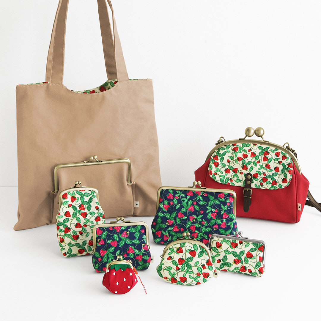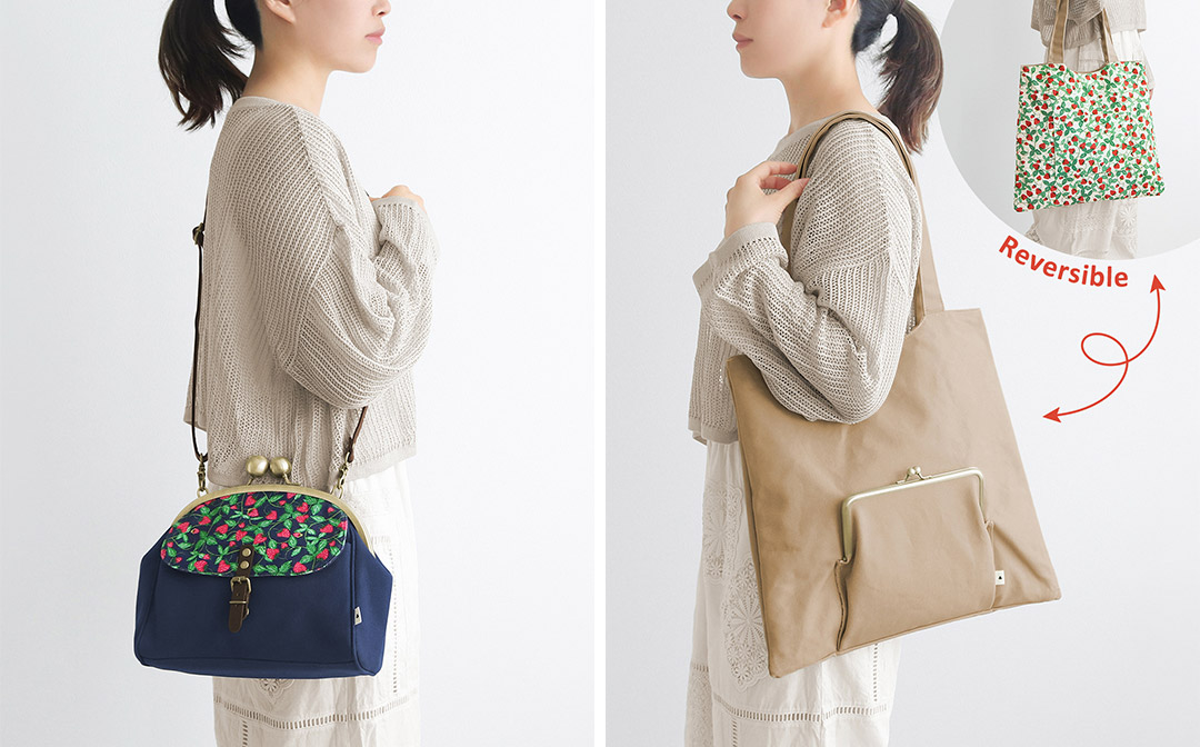バッグアイテムは、フラップ部分にいちご柄の生地を使用した「フラップ付き大玉がま口ポシェット」と、表と裏でデザインの変化が楽しめる「がま口リバーシブルトート」をご用意。がま口リバーシブルトートは無地の面にはがま口ポケット、柄生地の面にはフリーポケットが付いています。