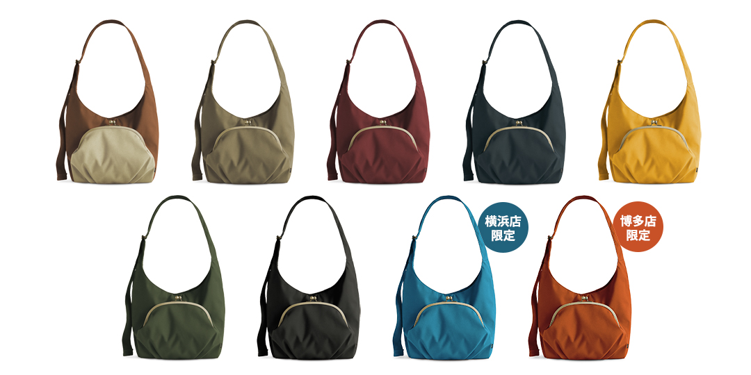 がま口ハバサックのみ、今回はコーデュラ®の定番カラー6色と、横浜ジョイナス店限定でマリンブルー、アミュプラザ博多店でオレンジも数量限定で展開します!