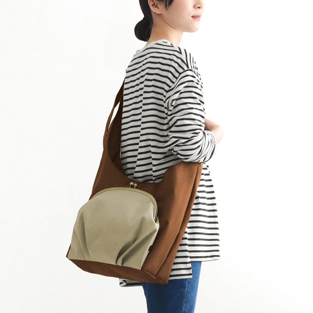 メイン収納はA4サイズが横向きにちょうど入る大きめサイズで、ガバっと大きく開いて厚みのある荷物も楽々収納できます。小物の仕分けに便利な内ポケット付き。立体的ながま口ポケットにはA5サイズが入れられて、こちらにも内ポケットが付いています。