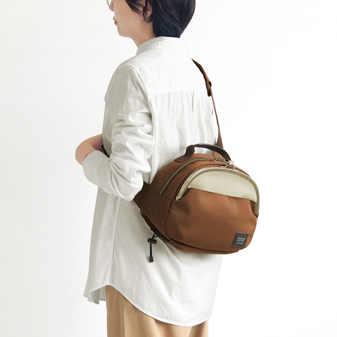 丸いフォルムが特徴的な「ポシェット型がま口ボディバッグ」は、マチ幅が大きめで、見た目以上に容量たっぷりです。ベルトを伸ばせばショルダーバッグとしても使えます。