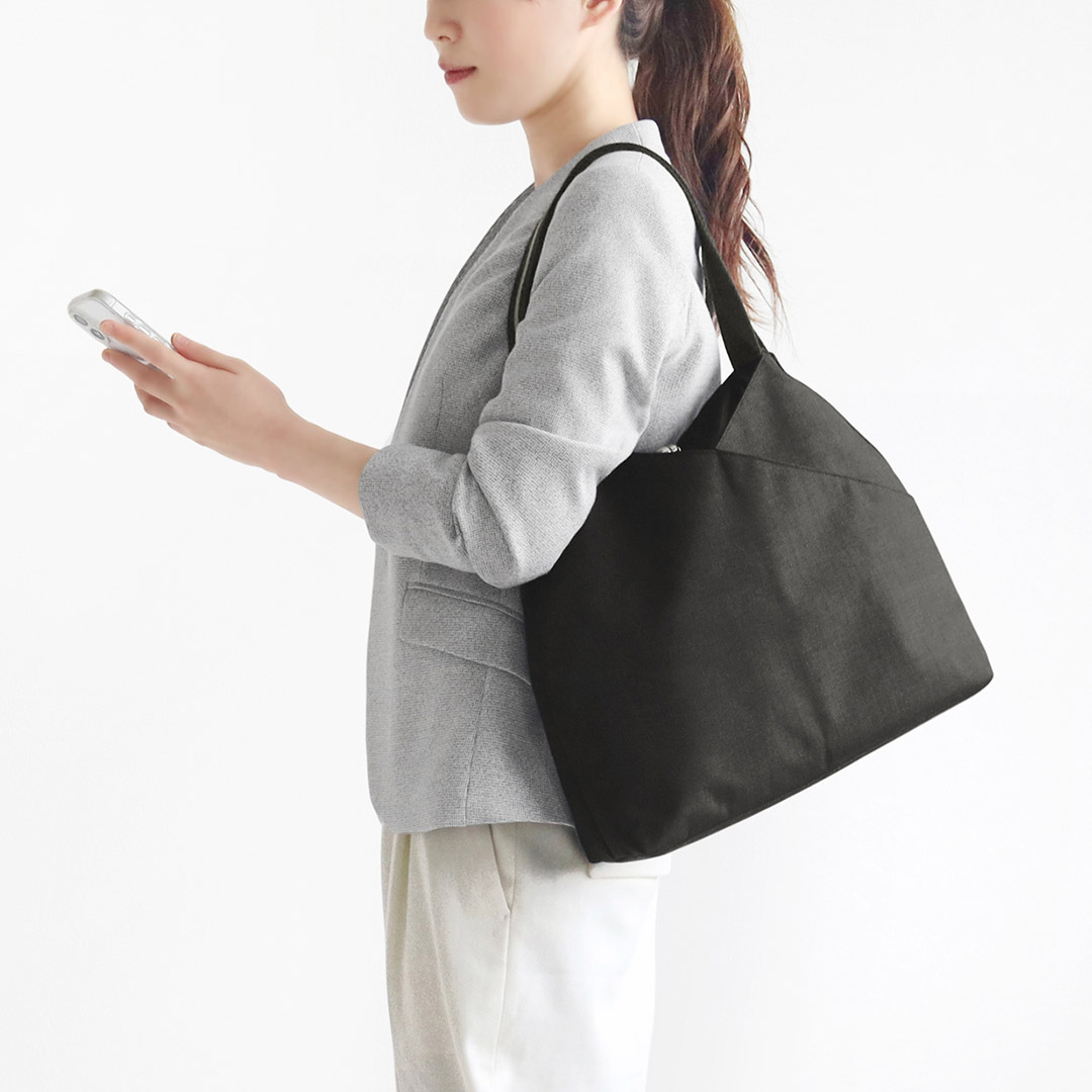 A4サイズにも対応した、V字カットがポイントのトートバッグ。すっきりとしたデザインで、オフィスカジュアルにもおすすめです。