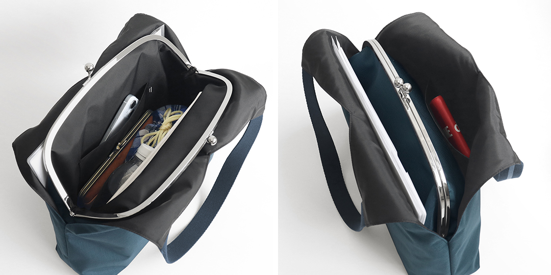 がま口の中にはペットボトルやお弁当、B5サイズが入り、背面側には内ポケット付いています。がま口の両サイドはA4サイズが入るオープンポケットになっており、正面側には小さめの内ポケットがあります。