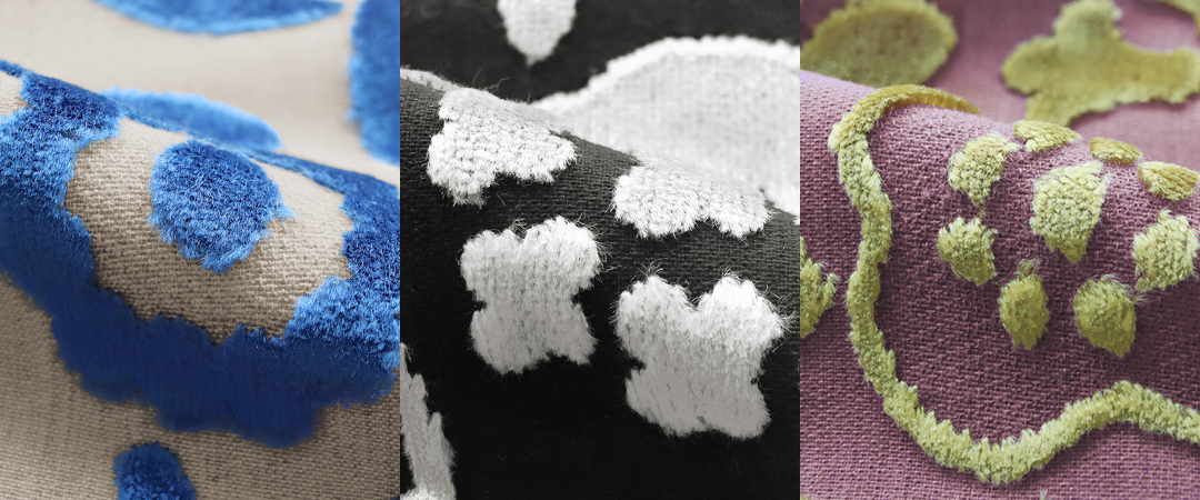 ベースにはリネン混のナチュラルな生地を使用。光沢感がある立体的なカットパイル部分は見る角度によって色の違いが楽しめます。アクセントが効いたベージュ×ブルー、シンプルで洗練されたブラック×グレー、華やかで明るいパープル×イエローの3色展開です。