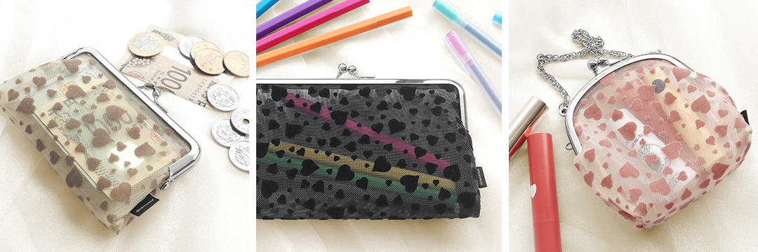 透け感のあるナイロンメッシュにフロッキー加工のハート柄をプリントした「ハートフロッキーメッシュ」シリーズが登場!お気に入りの小物を入れて“見せる”収納を楽しめます。