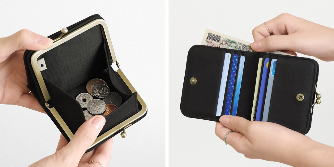 大きく開くBOX型の小銭入れは中が見やすく、取り出しやすいのが特徴。お札はスッと入れられて、6つのカードポケット付きなので必要最低限のカードが収納できます。