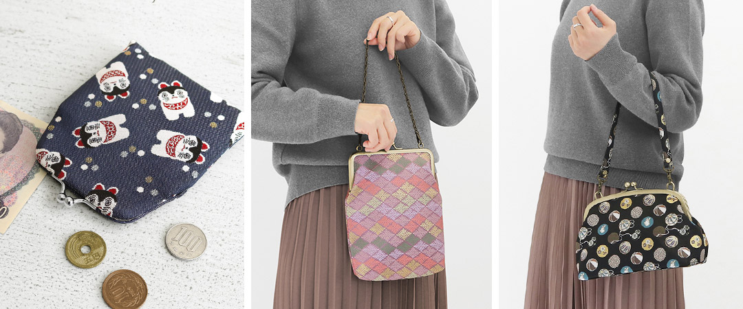 がまポチ袋 ¥1,980【実店舗限定】/ 仕切り付きがま口カードケース ¥2,970 / 三枚口財布 ¥3,190 / 縦型がま口御朱印帳ケース ¥4,455【実店舗限定】/ 横長がま口ハンドバッグ ¥7,480【実店舗限定】